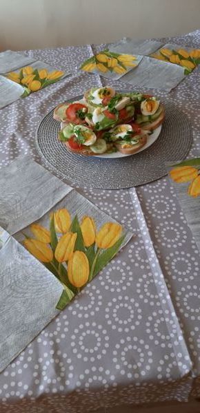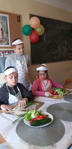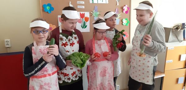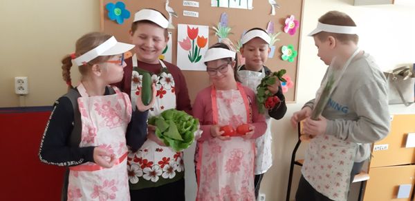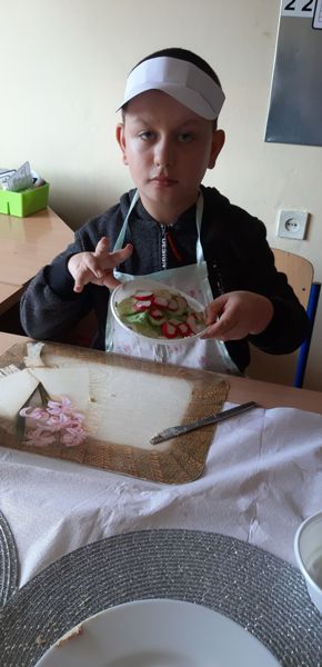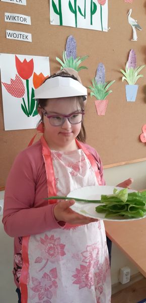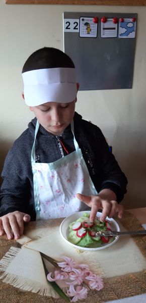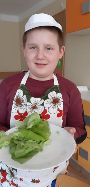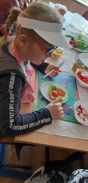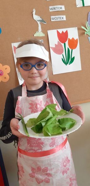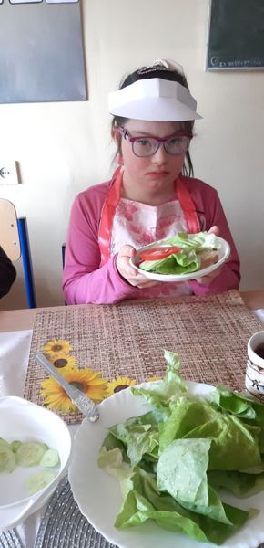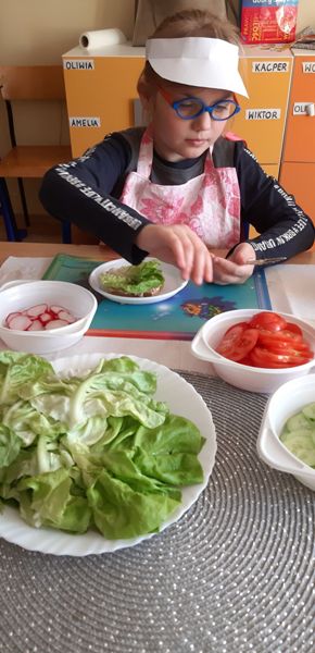 Okres wiosenny to doskonały czas do wykorzystania nowalijek, które coraz częściej pojawiają się w sklepach, czy przydomowych szklarniach. Uczniowie klasy II a przynieśli do klasy sałatę, pomidory, ogórki, rzodkiewki, szczypiorek. Zapachy spotęgowały uczucie głodu. Postanowiliśmy przygotować kolorowe kanapki. Po krótkim omówieniu kolejnych czynności oraz zasad bezpiecznej pracy, higieny, przystąpiliśmy do pracy. Uczniowie samodzielnie i dokładnie myli warzywa, po czym smarowali chleb masłem kroili warzywa na desce. Efekt był wspaniały.