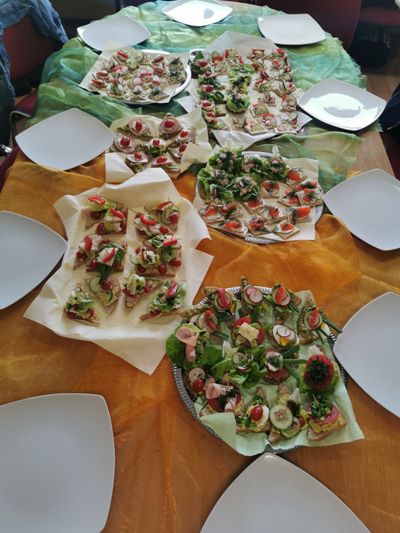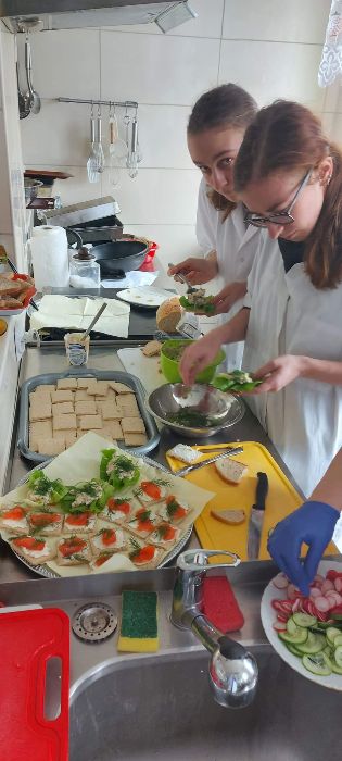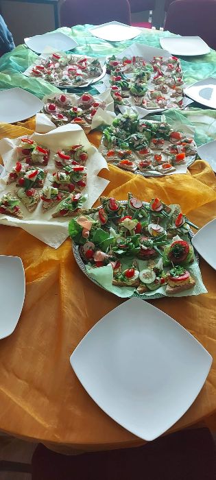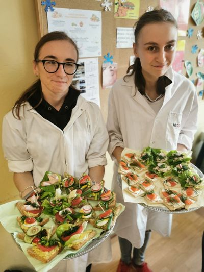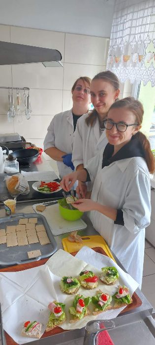 W dniu 13 maja 2021 roku w klasie III Kucharz Branżowej Szkoły I Stopnia odbyła się lekcja otwarta z zajęć praktycznych, przeprowadzona przez panią Milenę Szczucką. Temat lekcji: „Zakąski na zimno - tartinki i mini kanapki”. Celem lekcji było: doskonalenie umiejętności wykonywania tartinek i mini kanapek. W ramach zajęć uczniowie przygotowali trzy rodzaje past: z awokado, jajeczną oraz pastę rybno-serową. Zgodnie z zasadą BHP i procedurą gastronomiczną zostały wykonane przez uczniów zakąski zimne. Do dekoracji kanapek wykorzystano owoce i warzywa w tym nowalijki, pełne witamin i świeżego smaku. Podczas zajęć uczniowie nabyli umiejętności dekorowania i ekspedycji potraw. Wszyscy wykazali się ogromną pomysłowością i kreatywnością podczas przygotowywania zakąsek na zimno, a po wykonaniu zadań zaprezentowali efekty swojej pracy i przystąpili do degustacji.