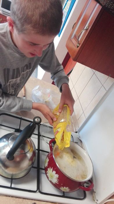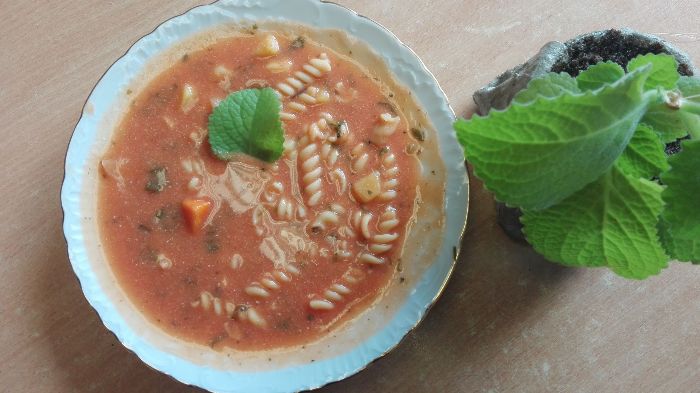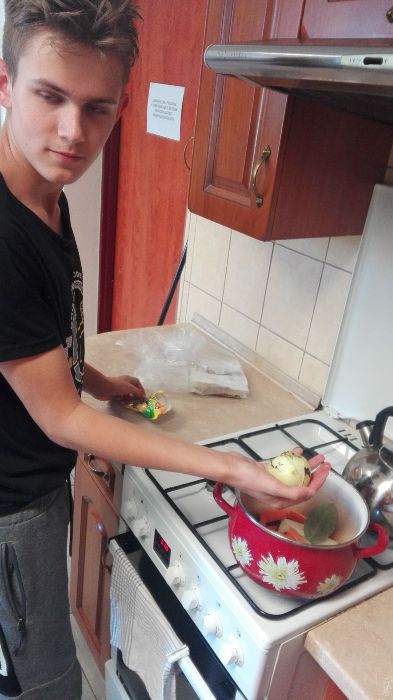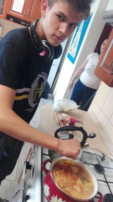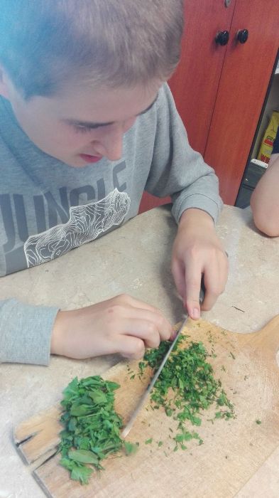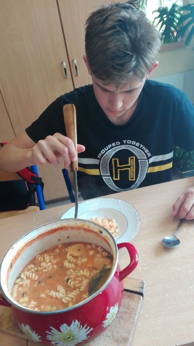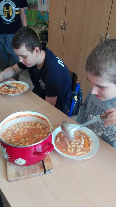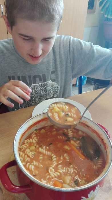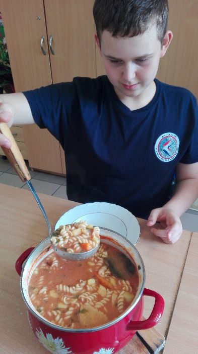 Kontynuujemy działania w ramach akcji promującej zdrowe odżywianie i własnoręczne przygotowywanie posiłków. Uczniowie klasy siódmej ugotowali przepyszną zupę pomidorową z dodatkiem ziół z własnego ogródka. Dobry pomysł, trochę wspoólnej pracy i jaka smaczna zupa!![]()