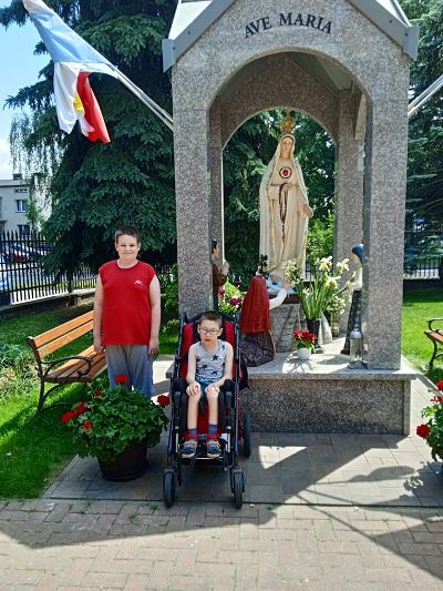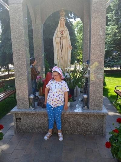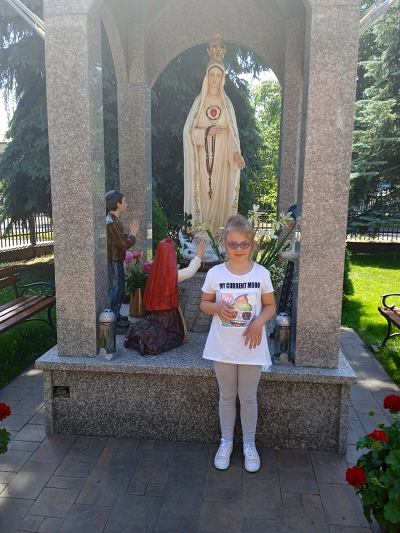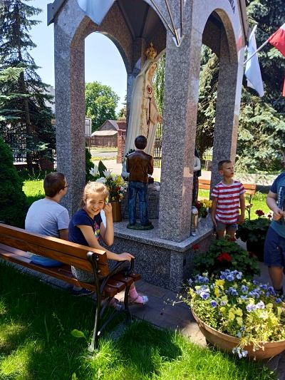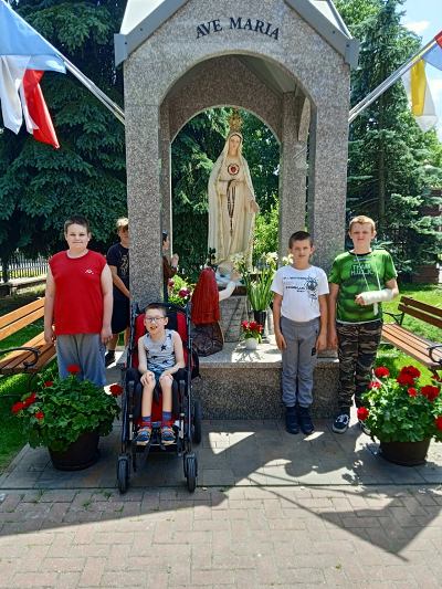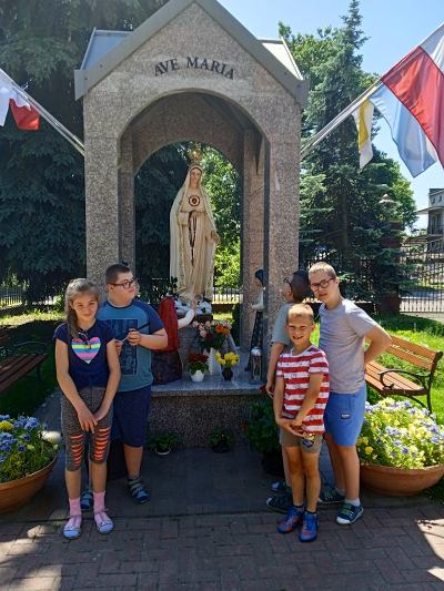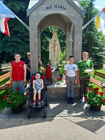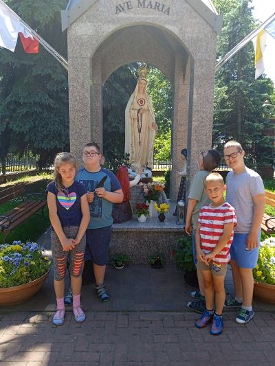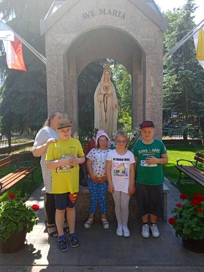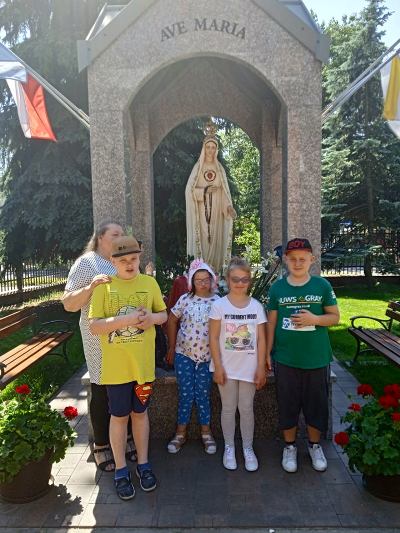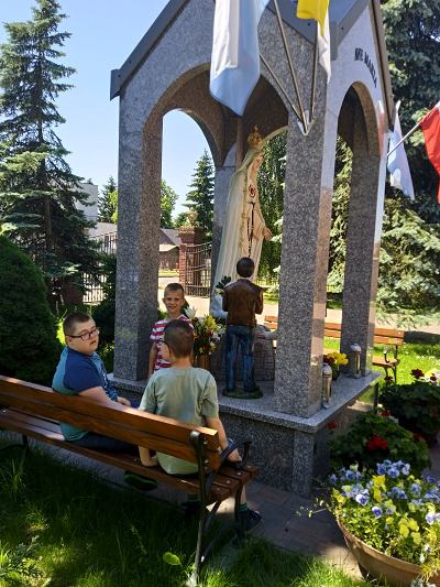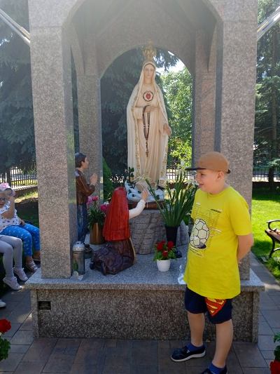 W ostatnim tygodniu nauki, uczniowie klas młodszych, modlitwą przy figurze Matki Bożej Fatimskiej podziękowały Panu Bogu za pracę w roku szkolnym 2020/2021. Piękne figurki Maryi oraz trójki pastuszków, znajdujące się na placu przy kościele MBNP w Hrubieszowie, wzbudziły podziw dzieci i przypomniały historię objawień fatimskich. Natomiast obrazy 14 stacji Drogi Krzyżowej, widniejące na otaczającym kościół parkanie, utrwaliły katechetyczne treści. Pobyt w tym miejscu okazał się ciekawą i urozmaiconą formą lekcji religii.