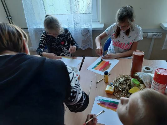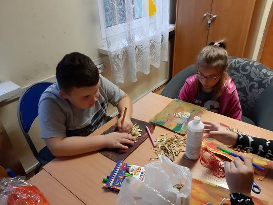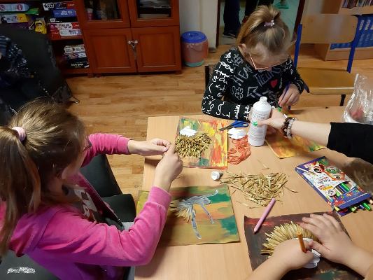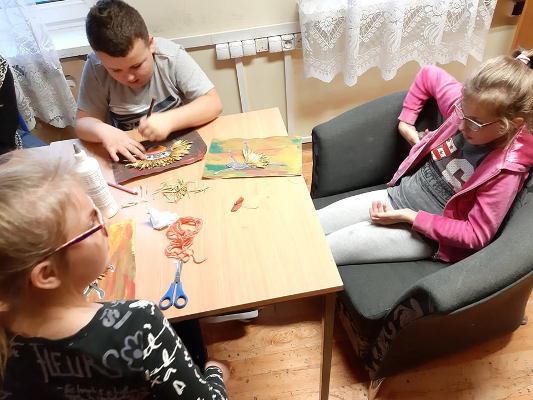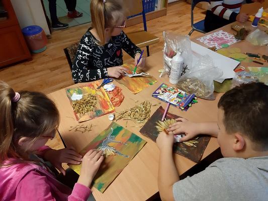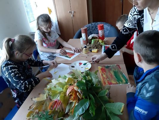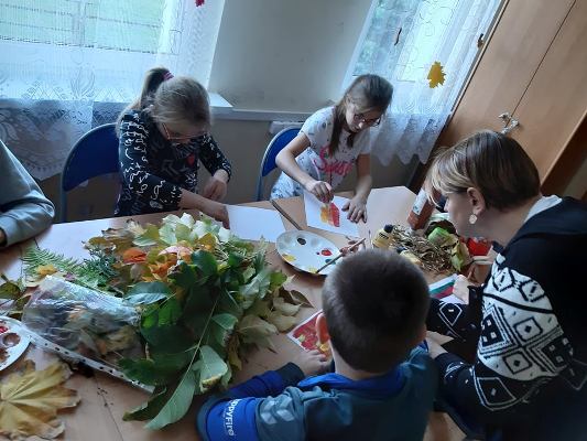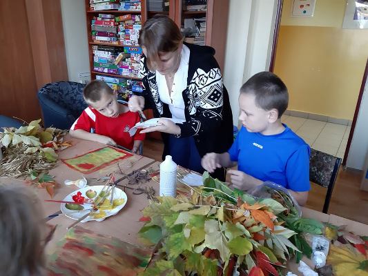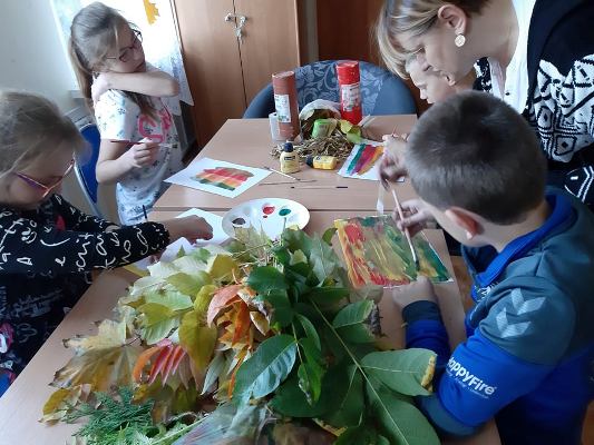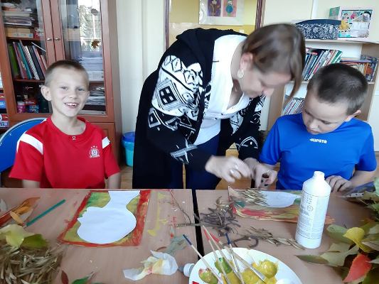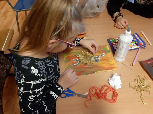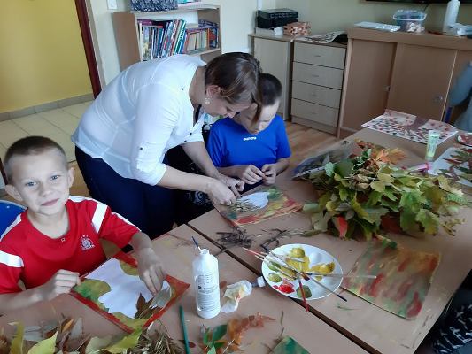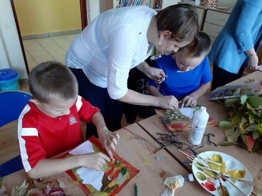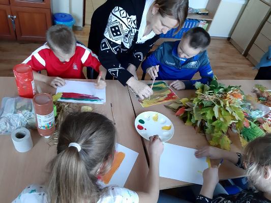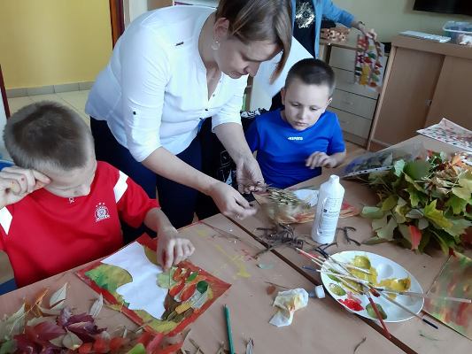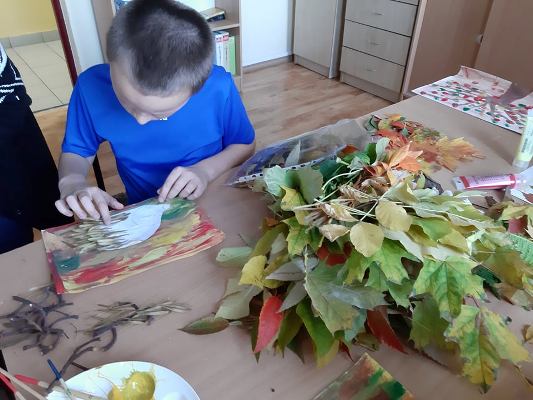 Wychowankowie grupy I uczestniczyli w zajęciach plastycznych, podczas których tworzyli prace na konkurs pod hasłem „Barwy jesieni”. Do tworzenia prac wykorzystano elementy hortiterapii. Bezpośredni kontakt z roślinami, dobór barw, kształtów i faktur sprawiał dzieciom wiele radości oraz pobudzał wyobraźnię i inwencję twórczą.