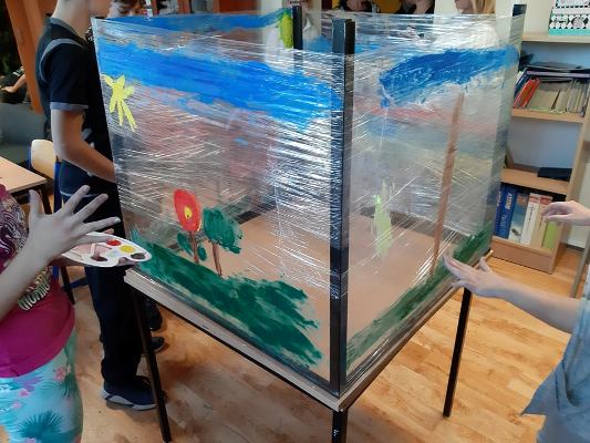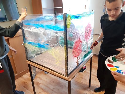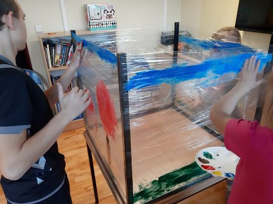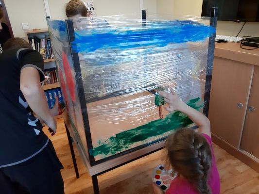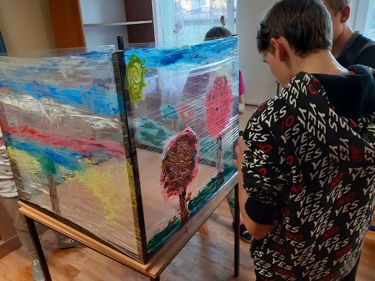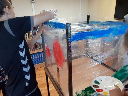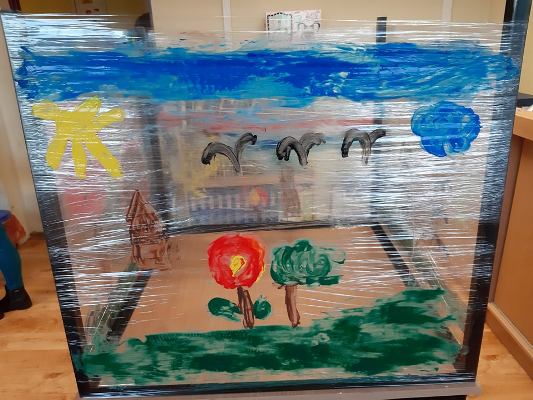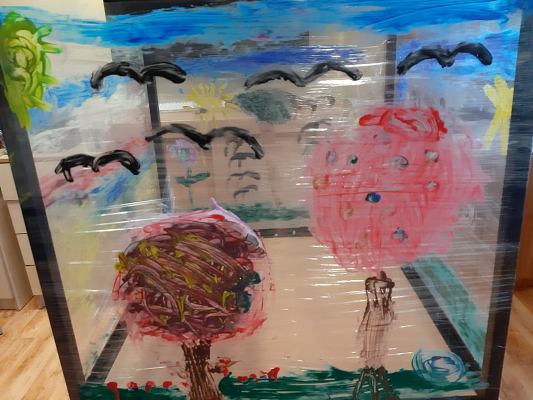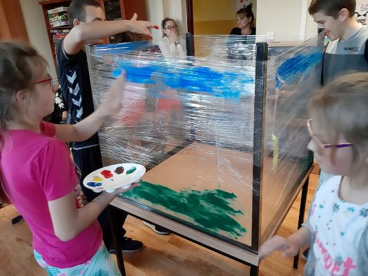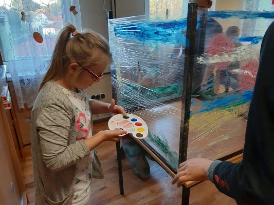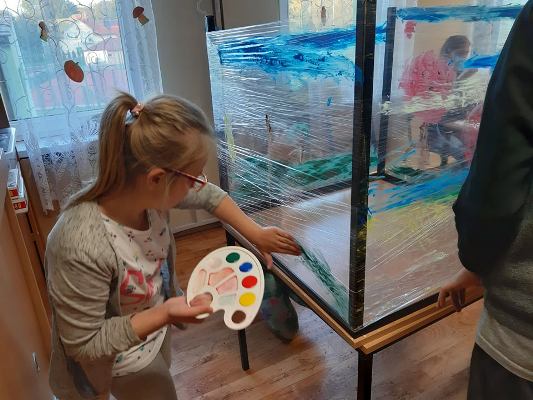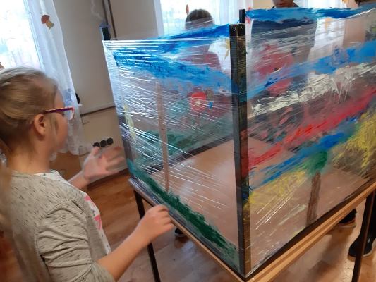 Malowanie to jedna z najchętniej wykonywanych przez dzieci czynności, a jeśli rozmaitymi technikami i na różnych materiałach to staje się doskonałą formą zabawy i rozwijania kreatywności. W grupie I przeprowadzone zostały zajęcia „Jesienny pejzaż - malowanie na folii przezroczystej”. Takie malowanie to zupełnie inna forma działań plastycznych oraz sensorycznych. Malując na folii spożywczej dzieci stymulują zmysł dotyku oraz wzroku. Jest to także doskonałe ćwiczenie motoryki małej, koordynacji wzrokowo-ruchowej oraz kreatywności. Zabawa pozwoliła w pełni rozwijać potencjał twórczy młodych artystów.