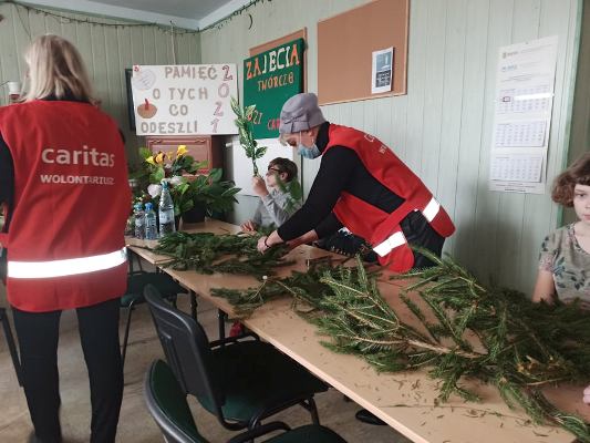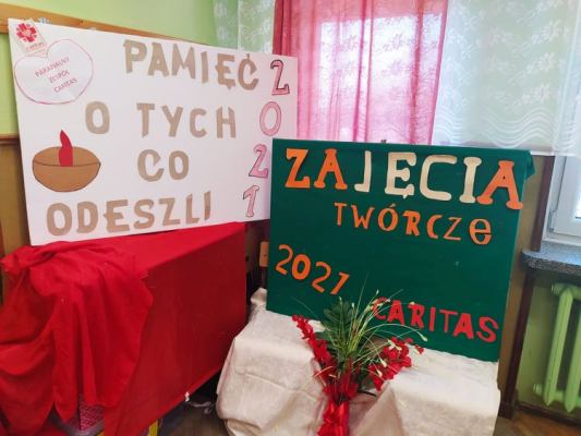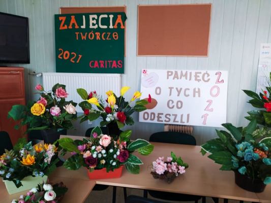 W tym listopadowym, szczególnym czasie łączy nas potrzeba pamięci o tych, którzy odeszli. Z myślą o nich wolontariusze caritas w dniu 26 października 2021 r. zaplanowanych zajęciach twórczych wykonywali wieńce, wiązanki w ramach przeprowadzonych akcji "Pamięć o tych co odeszli". To dla nich po raz kolejny udamy się na cmentarz by czcić Ich pamięć. Z nostalgią i w zadumie wspominamy bliskich i znajomych, których nie ma wśród nas. Naszą akcją obejmujemy również groby zaniedbane i opuszczone. Wspomnienie o nich to nie tylko wyraz szacunku wobec nich ale deklaracja, że pamięć o tych co odeszli w naszych sercach nigdy nie zgaśnie.