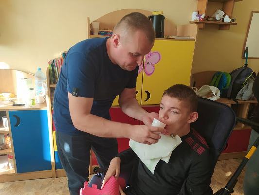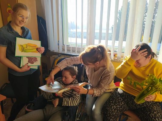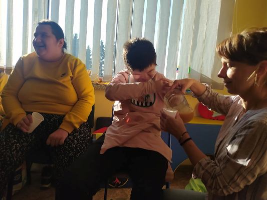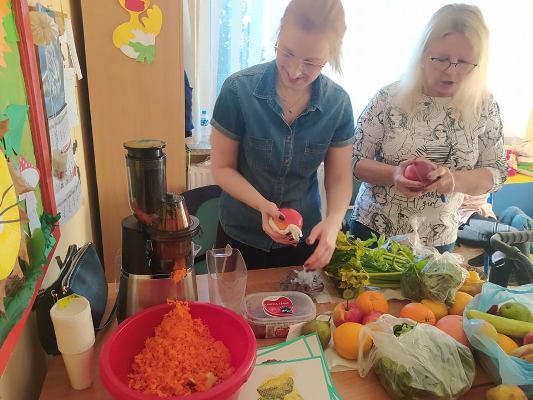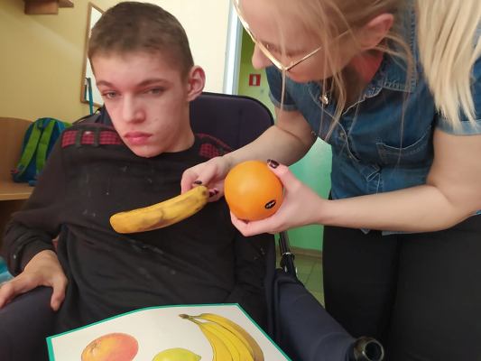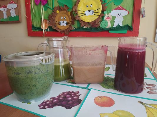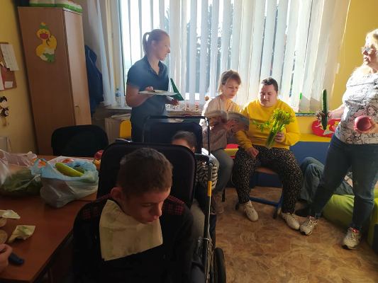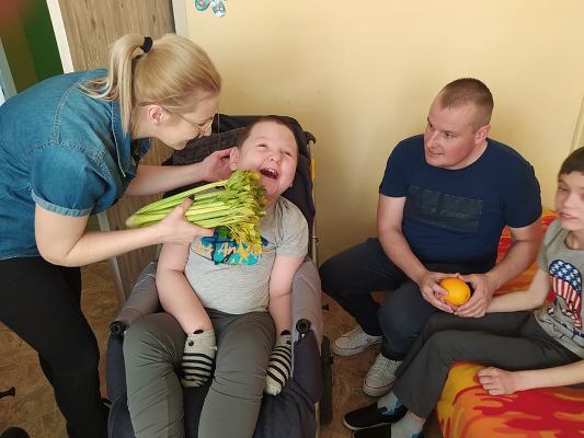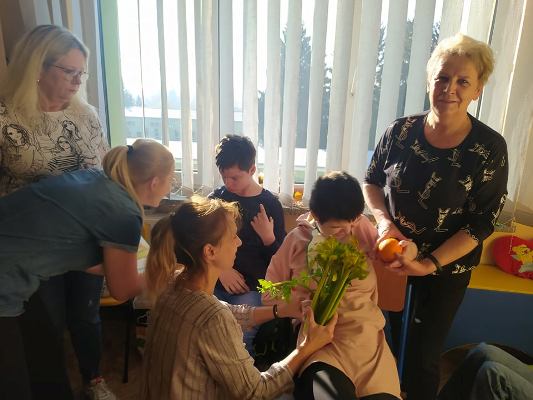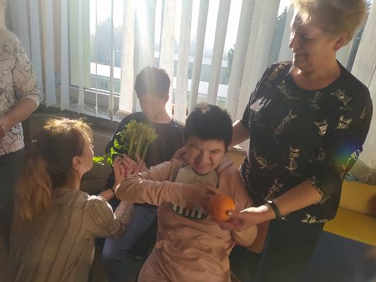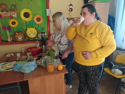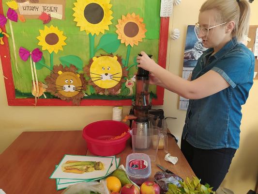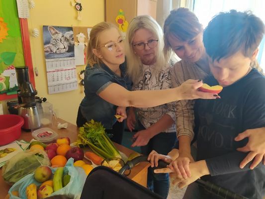 W dniu 29.11.2021 r. w zespołach rewalidacyjno – wychowawczych została zorganizowana lekcja integracyjna promująca zdrowy styl życia. Celem zajęć było zapoznanie uczniów z zasadami prawidłowego odżywiania oraz zachęcenie do spożywania warzyw i owoców. Na początku uczniowie wysłuchali wierszy o warzywach a także dowiedzieli jaką rolę w naszym jadłospisie pełnią warzywa i owoce. Dzieci wielozmysłowo poznawały jesienne dary sadu i ogrodu: dotykały, oglądały, wąchały i smakowały pyszne świeżo wyciśnięte soki warzywno - owocowe. Dziękujemy bardzo rodzicom za pomoc w przygotowaniu zajęć.