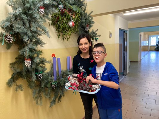 W ramach realizacji programu zajęć z elementami hortiterapii uczniowie klas IV - VIII z dużym zaangażowaniem wykonywali wieniec adwentowy. Cała dekoracja zawiera przede wszystkim naturalne materiały zgromadzone i przetworzone przez uczniów na zajęciach rozwijających kreatywność. Przy wykonaniu wieńca uwzględniono także własciwą kolorystykę i kolejność ustawienia świec zgodnie z tradycją adwentową. Uczniowie - autorzy tej pięknej dekoracji są dumni z ekspozycji wieńca na drugim piętrze budynku naszej szkoły. Bardzo dziękujemy panu Wojciechowi Herdzie za wykonanie solidnego stelaża do naszej dekoracji.