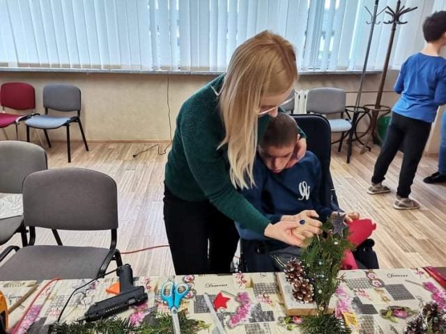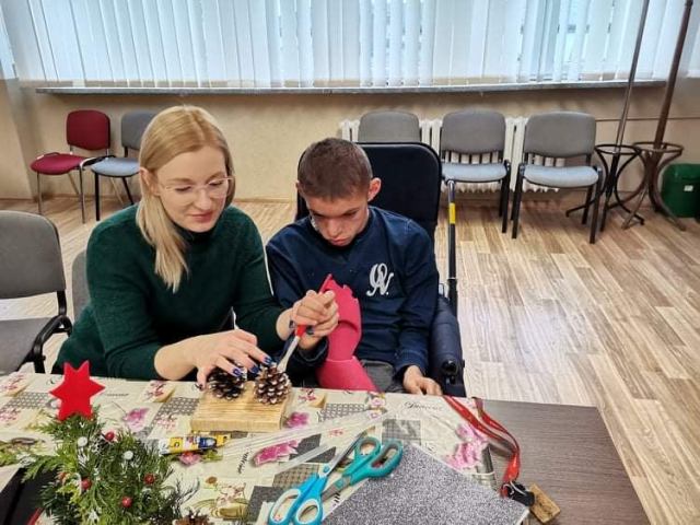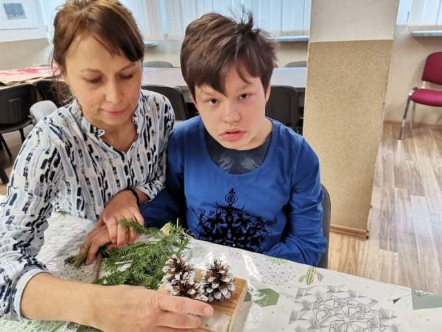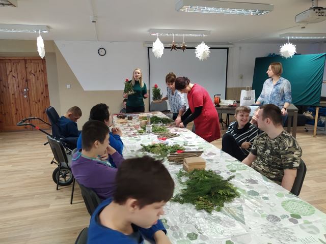 Właśnie z tej okazji dnia 17.12.2021r. dla dzieci z zespołów rewalidacyjno-wychowawczych oraz nauczycieli uczących w zespołach zostały zorganizowane świąteczne warsztaty plastyczne. Uczniowie wspólnie z nauczycielami malowali farbami szyszki, przyklejali gałązki i kolorowe bombki tworząc przepiękne świąteczne stroiki. Wszyscy wykazali się ogromnym talentem plastycznym i wielką wyobraźnią dekoratorską. Spotkanie było doskonałą okazją dla dzieci do integracji, miłego spędzenia czasu oraz wspólnej zabawy. Zajęcia przebiegały w miłej i serdecznej atmosferze, umiliły dzieciom oczekiwanie na święta i wprowadziły nas wszystkich w świąteczny nastrój.