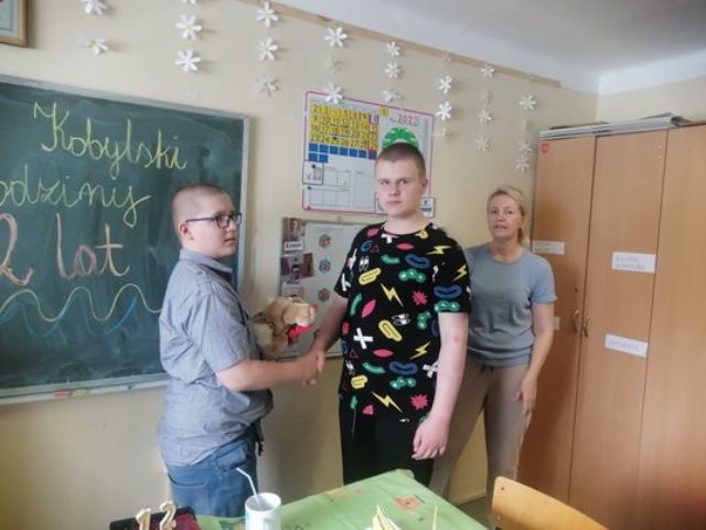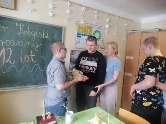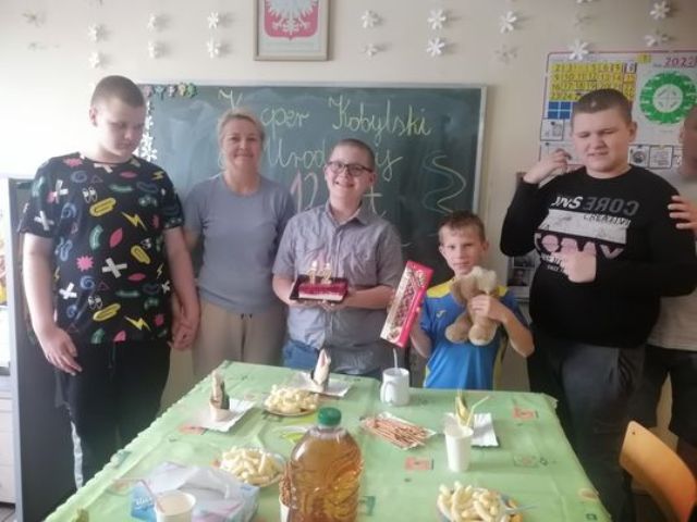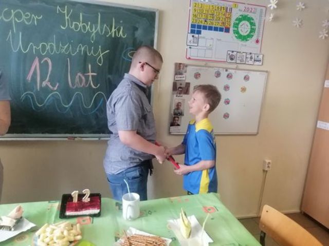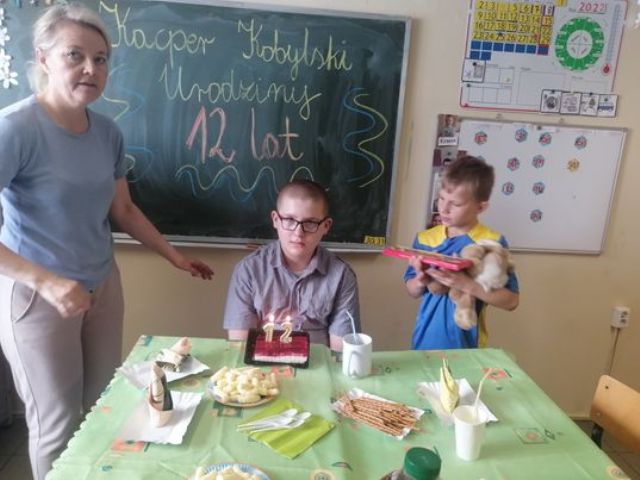W piątek Kacper obchodził 12 urodziny. Koledzy z klasy III PU wraz z wychowawczynią, przygotowali dla Jubilata przyjęcie niespodziankę! Sala szkolna została pięknie przystrojona, na stole królował urodzinowy torcik oraz pyszne słodkości. Wspólna zabawa sprawiła, że ten dzień był wyjątkowy.