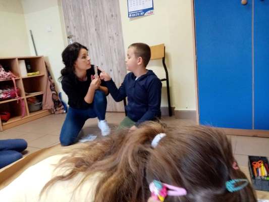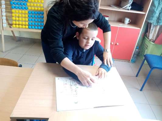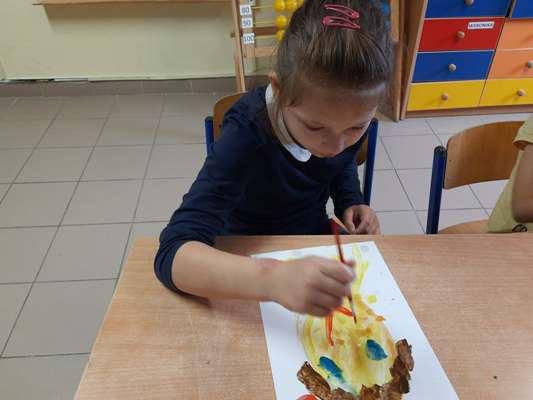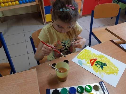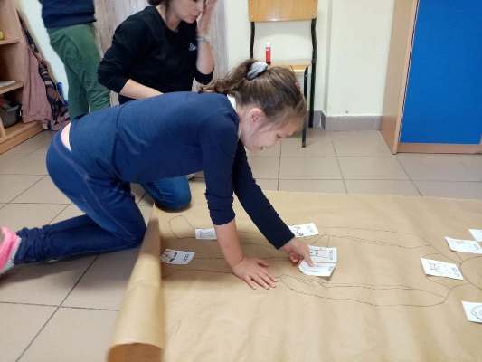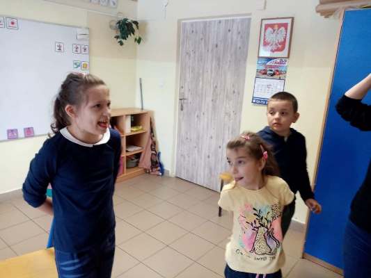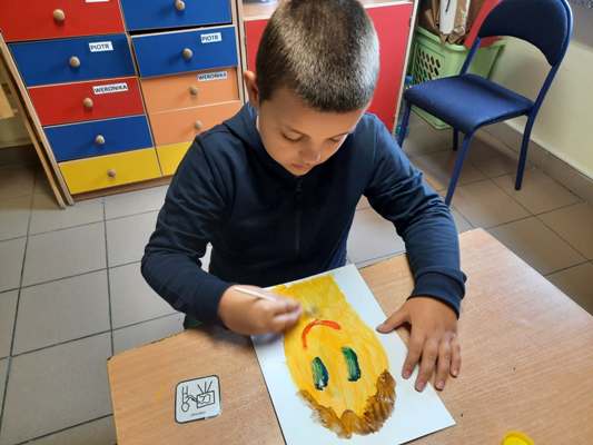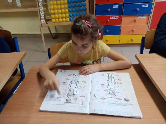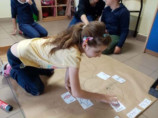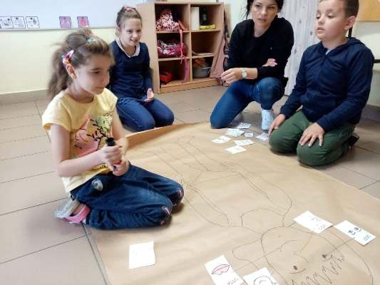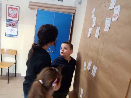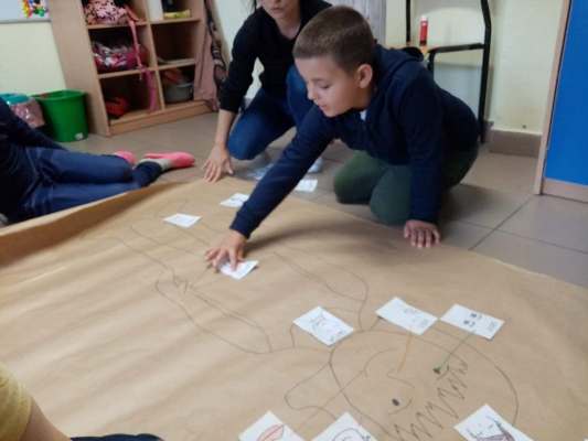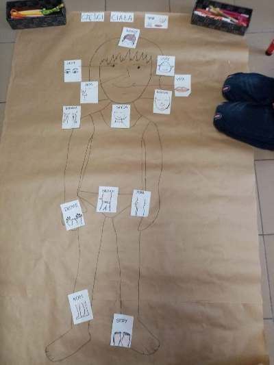 12 września, uczniowie najmłodszych klas szkoły podstawowej ćwiczyli orientację w schemacie ciała. Pokazywali na sobie i koledze poszczególne części ciała, nazywali lub powtarzali usłyszane nazwy, domalowywali brakujące elementy twarzy. Wspólnie uzupełniali szablon dziewczynki o symbole reprezentujące części ciała.