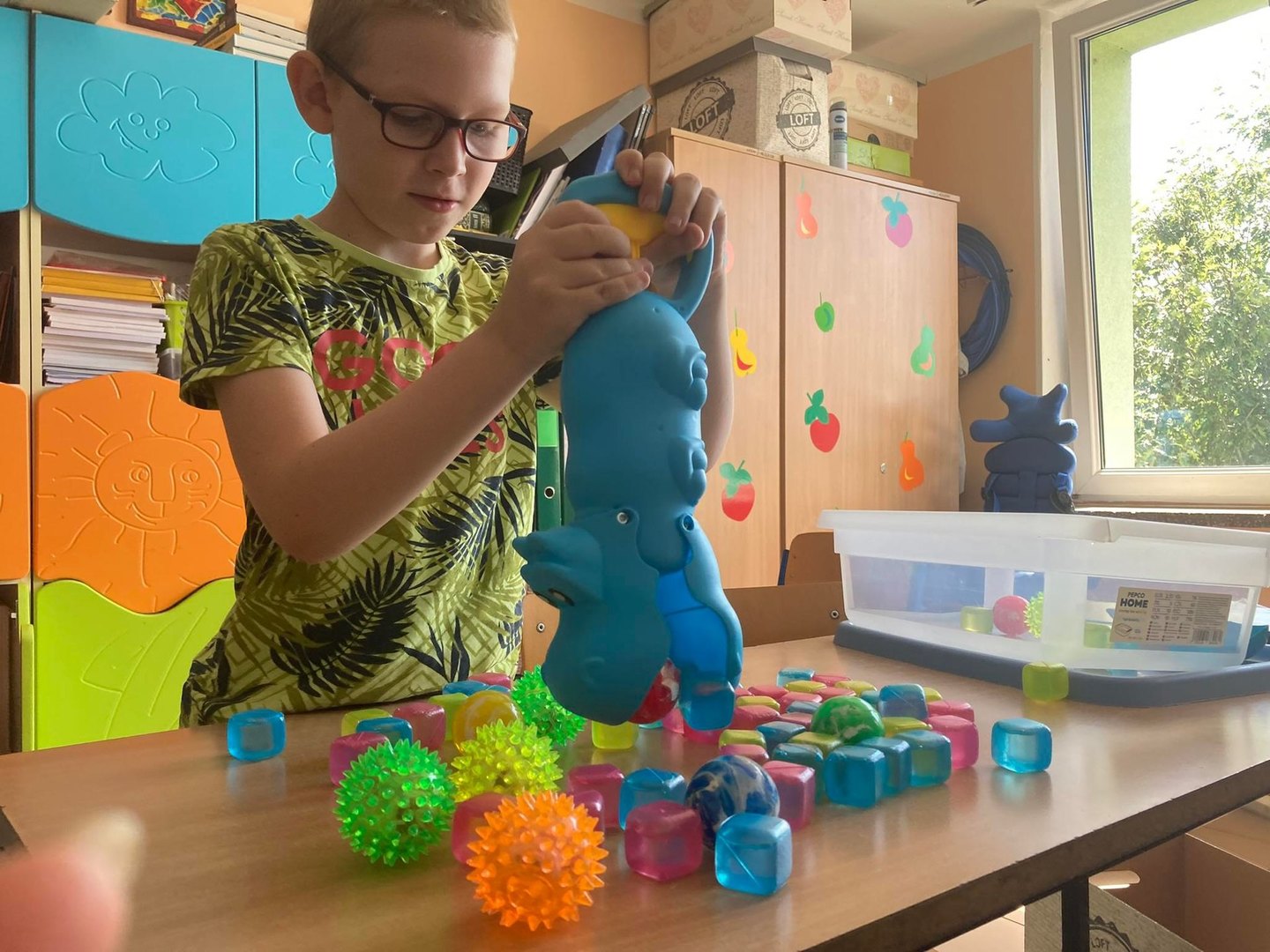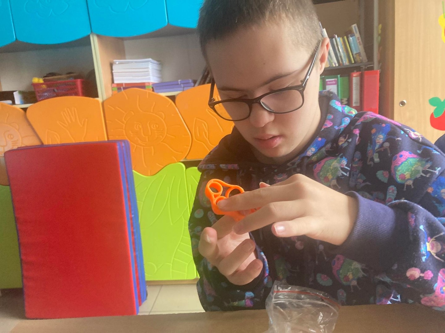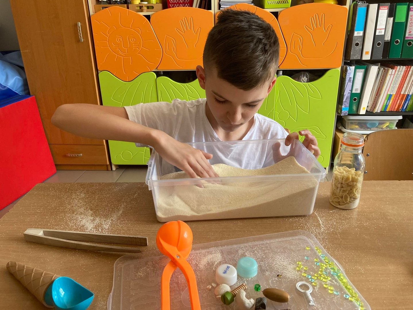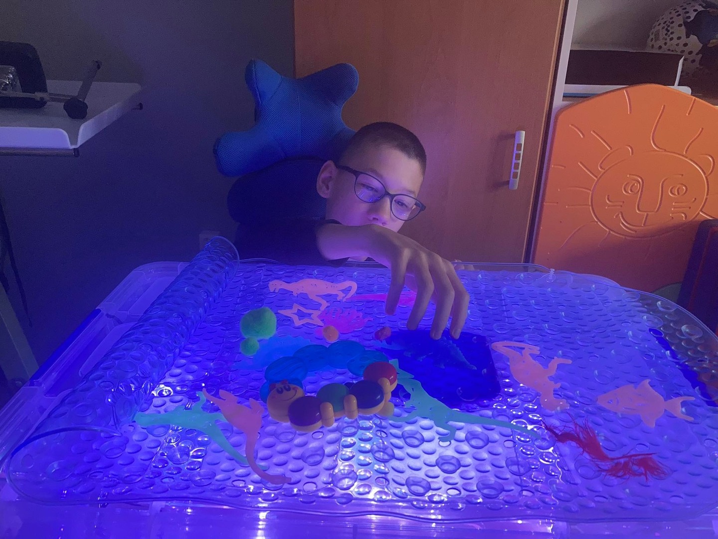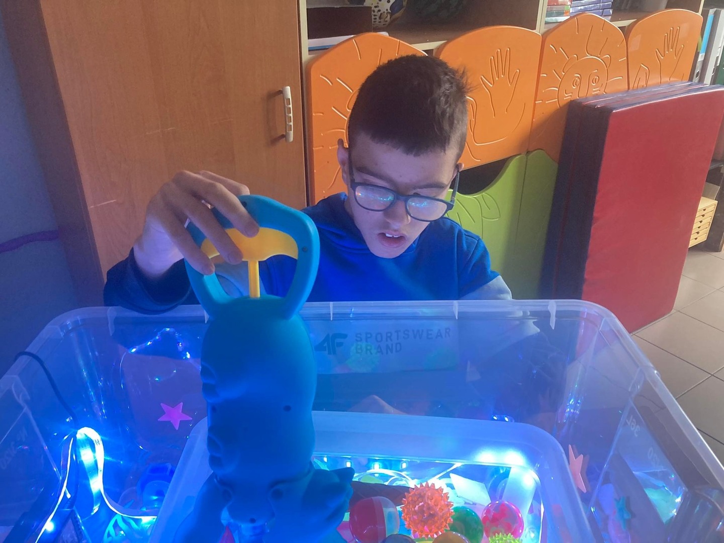 i terapeutycznego. Ćwiczenia realizowane na ciekawym materiale podnosiły atrakcyjność zajęć.  Dzięki zakupionym materiałom stworzony został podświetlany box oraz ciekawe pomoce terapeutyczne.