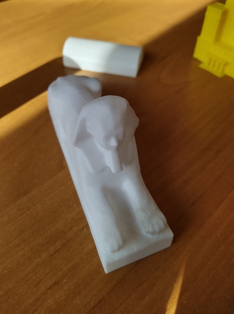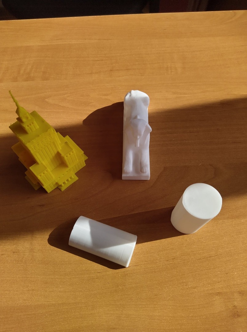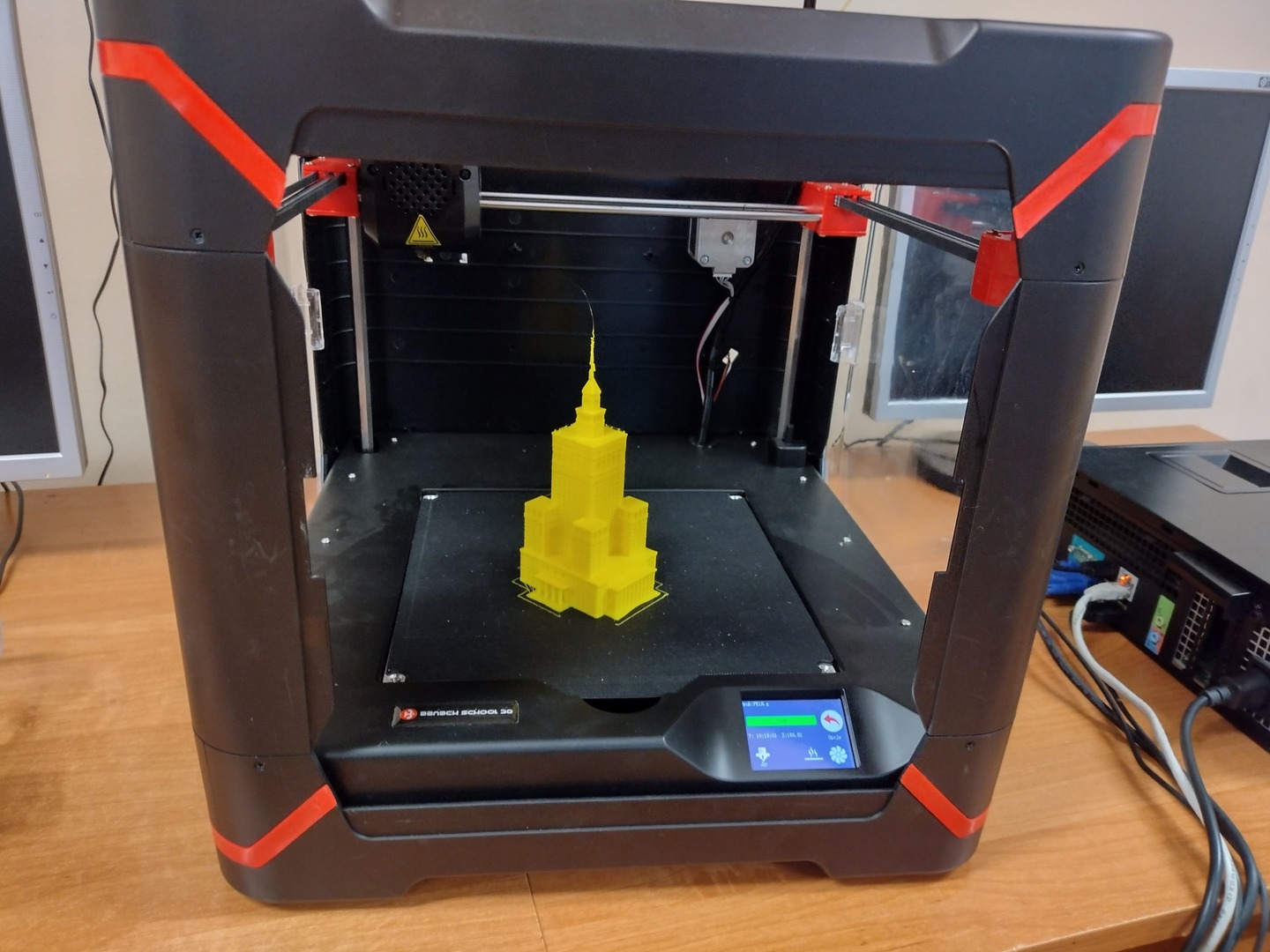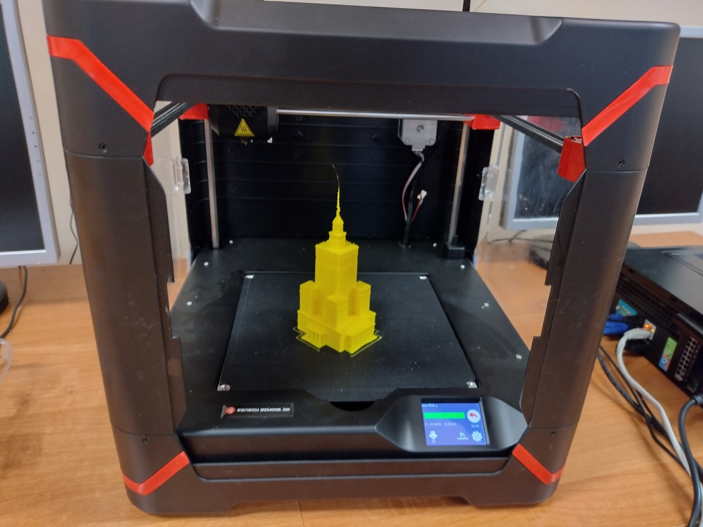 Uczniowie za pomocą drukarki 3D tworzyli przepiękne pomoce dydaktyczne: budynek Pałacu Kultury i Nauki, sfinks, bryły: walca i półwalca.