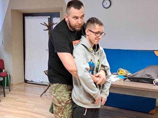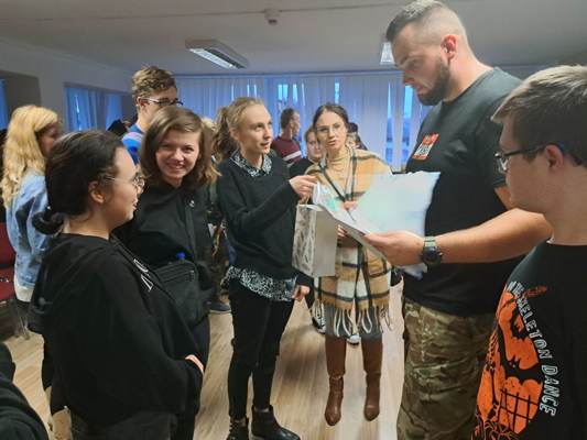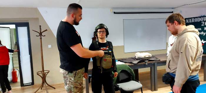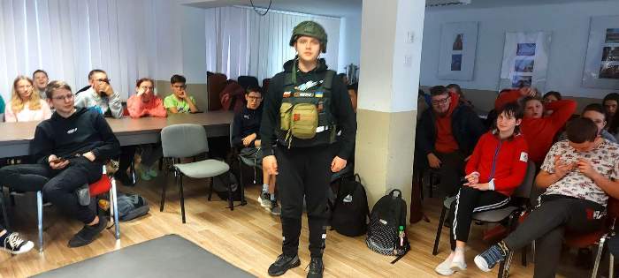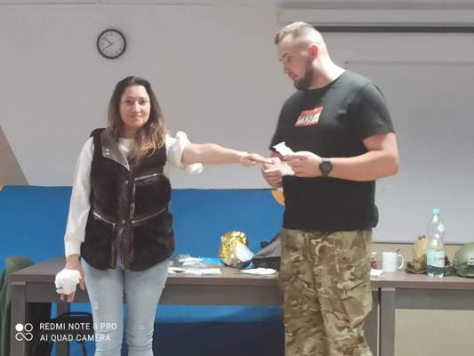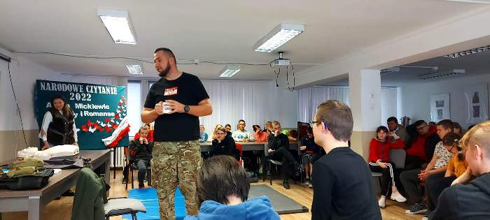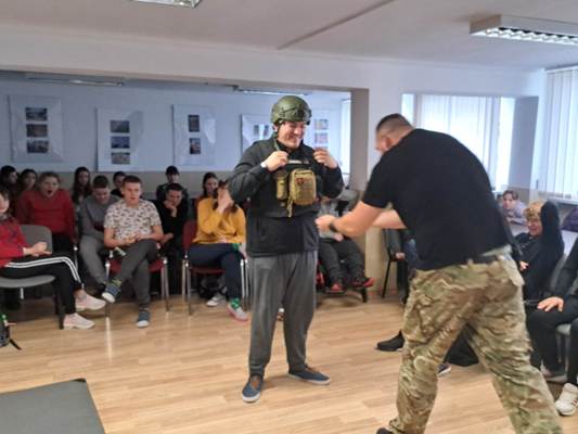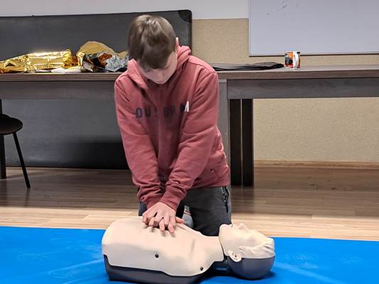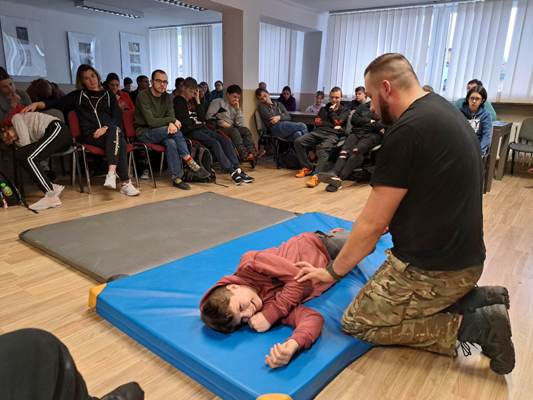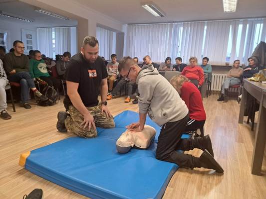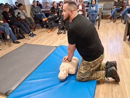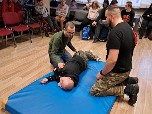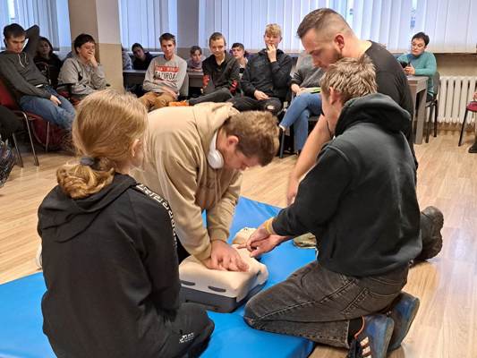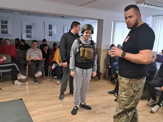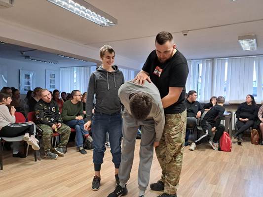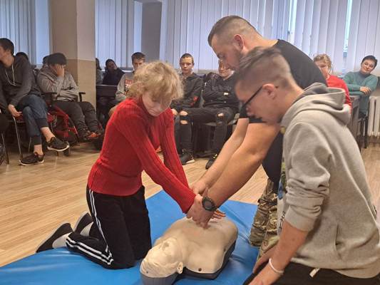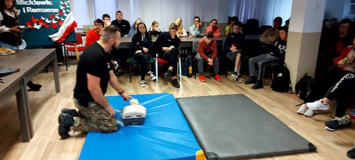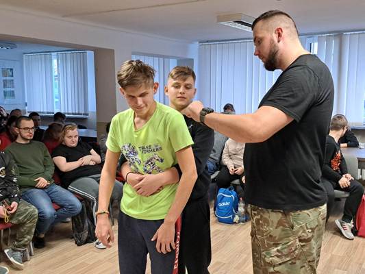 W czwartek w naszej szkole odbyło się szkolenie dla młodzieży „Pierwsza pomoc przedmedyczna i ewakuacja ludności cywilnej z obszarów zagrożonych poza strefą zagrożenia”. W pierwszym etapie szkolenia, młodzież zapoznała się ze sposobem organizacji i podejmowania podstawowych kroków oraz co należy zabrać ze sobą z domu podczas niezwłocznej ewakuacji ludności z obszarów, miejsc, w których wystąpiło nagłe, bezpośrednie zagrożenie życia ludności cywilnej poza strefę zagrożenia. Gdzie należy się schować, w razie ataków na ludność cywilną (schrony, piwnice). W drugim etapie szkolenia z pierwszej pomocy przedmedycznej uczniowie kontynuowali naukę z teorii, jak również ćwiczyli praktycznie. Z wykorzystaniem fantomu, ogólnodostępnych środków opatrunkowych i w jaki sposób należy je zastosować. Młodzież dostała wskazówki co jeszcze mogą wykorzystać w zabezpieczeniu ciała obcego w ciele i poranionymch dłoniach odłamkami u osoby poszkodowanej. Uczniowie przypomnieli sobie zasady wzywania pogotowia i prowadzenia RKO. Profesjonalne i interesujące szkolenia poprowadził Pan Marek Kończewski jako ratownik i strażak za co serdecznie dziękujemy Panu Markowi. Podziękowania również składamy firmie Sendpol za użyczenia fantomu. Dziękujemy bardzo serdecznie.