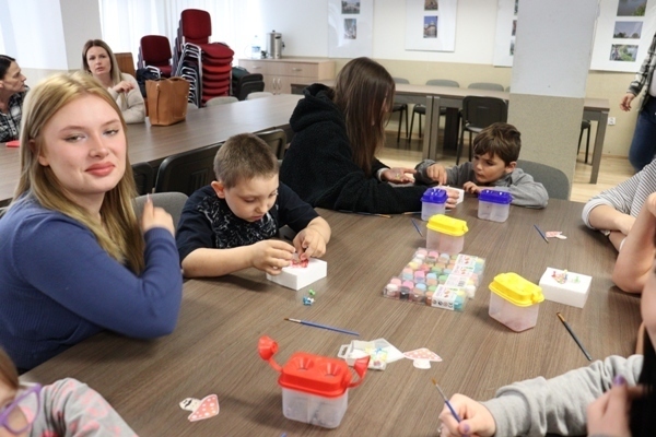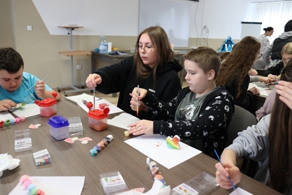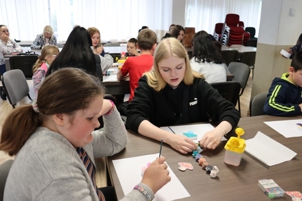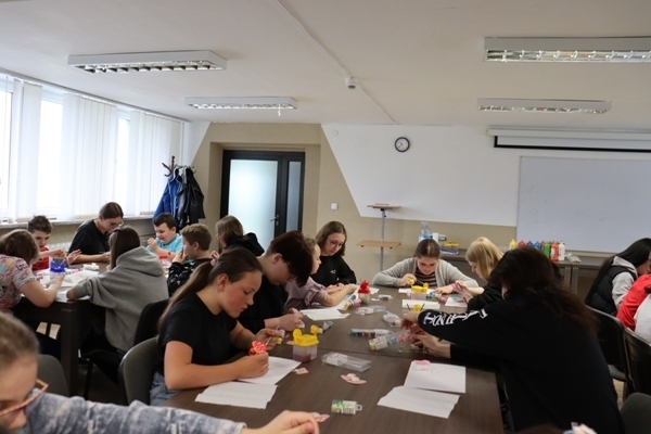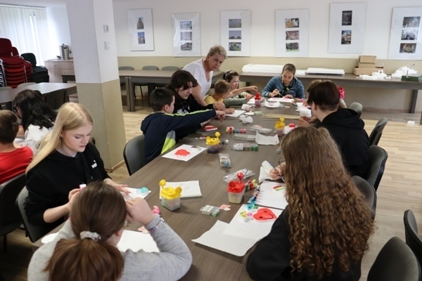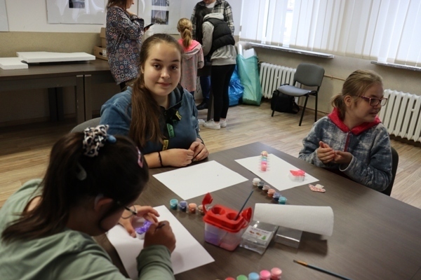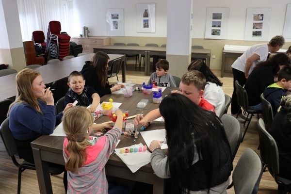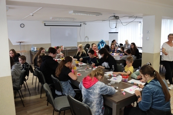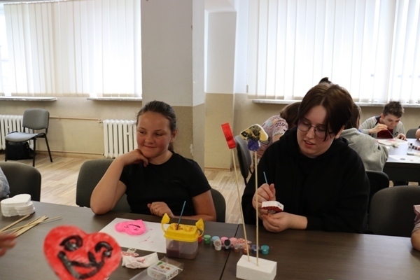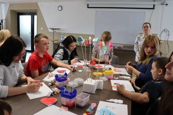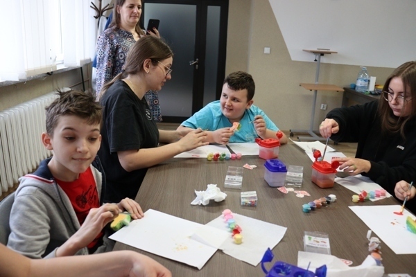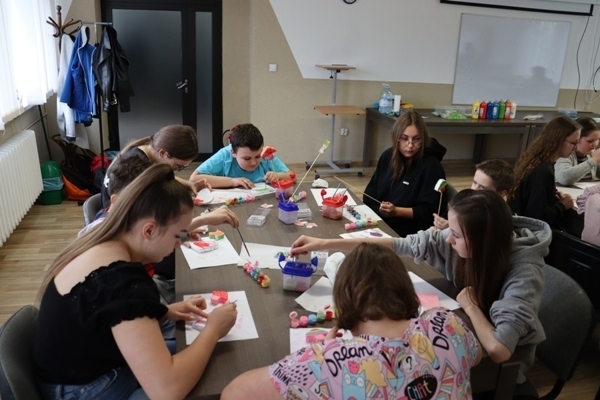 We wtorek najmłodsze dzieci naszego ośrodka uczestniczyły w warsztatach "Dobra zabawa to nie tylko tablet". Wspólnie z uczennicami klasy III E I Liceum Ogólnokształcącego im. ks. Stanisława Staszica w Hrubieszowie, wykonały śliczne, kolorowe muchomorki i serduszka. Podczas artystycznej zabawy uczestnicy samodzielnie wycinali kształty w styropianie, dobierali kolory i ożywiali barwami biel styropianu. Zajęciom towarzyszyły koleżeńskie rozmowy sprzyjające zintegrowaniu uczestników warsztatów. Wizyty młodzieży ze „Staszica” to stały element współpracy naszych szkół, to budowanie więzi i wyjątkowa okazja do integracji w pełnym znaczeniu tego ważnego dla nas słowa.