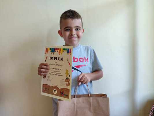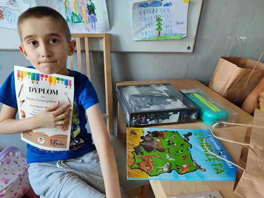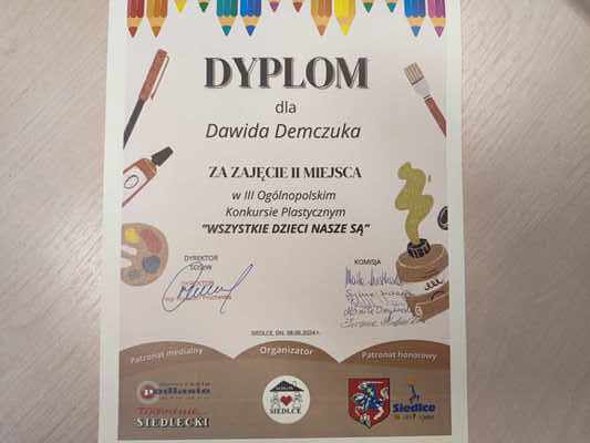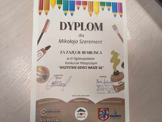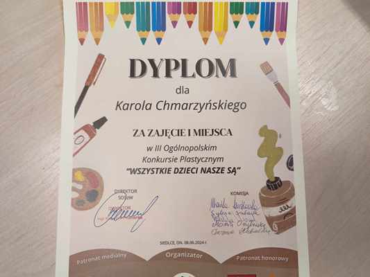Uczniowie klasy pierwszej wzięli udział w ogólnopolskim konkursie plastycznym ,,Wszystkie dzieci nasze są" organizowanym przez Ośrodek Specjalny w Siedlcach. Ich prace zostały wysoko ocenione. Pierwsze miejsce w kategorii szkoła podstawowa zajął Karol Chmarzyński, drugie Dawid Demczuk a trzecie Mikołaj Szerement. Uczniowie otrzymali pamiątkowe dyplomy i bardzo ciekawe nagrody, za które serdecznie dziękują organizatorom.