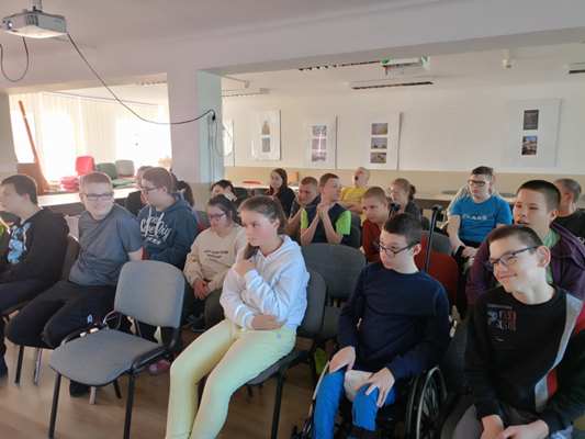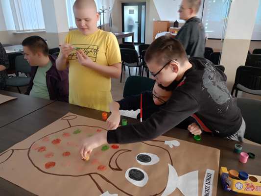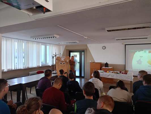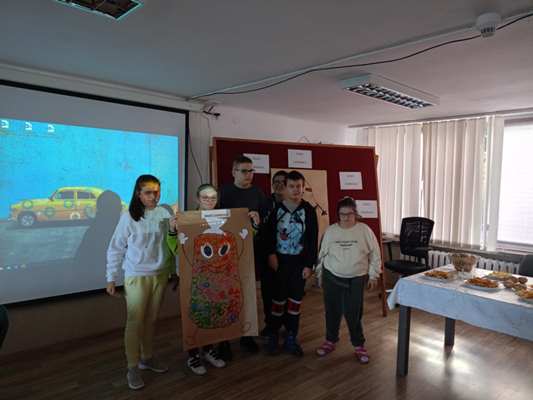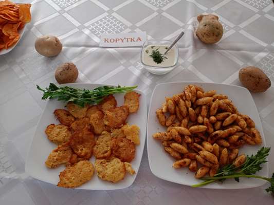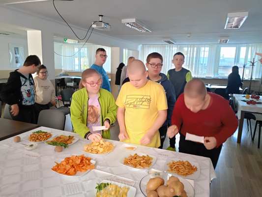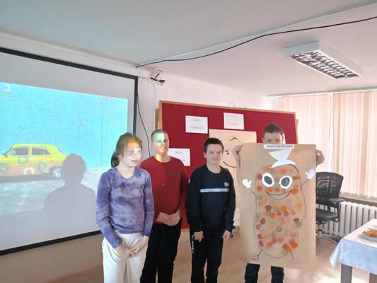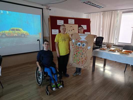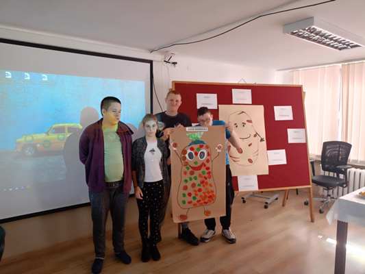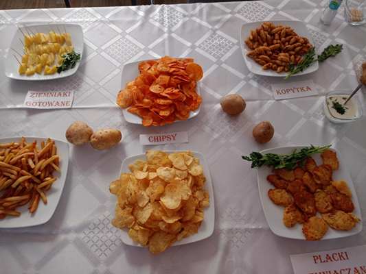 W dniu 23 października w naszej szkole odbyły się warsztaty edukacyjno - kulinarne pt., "Dzień Ziemniaka" dla uczniów klas IV-VIII szkoły podstawowej. Uczestnicy rozpoczęli spotkanie obejrzeniem filmu edukacyjnego ,,Alex i Franek edukują o ziemniaku”, z którego między innymi dowiedzieli się skąd pochodzi ziemniak, o odmianach ziemniaka, o uprawie a także o potrawach z tego warzywa. Następnie każda klasa miała za zadanie wykonać pieczątki z ziemniaka na wcześniej przygotowanych dużych arkuszach. Dzieci malowały farbą na rożne kolory przekrojone ziemniaki i stemplowały swoje prace. Po skończonych zajęciach plastycznych, uczniowie mogli skosztować potraw z ziemniaków, przygotowanych przez jedną z klas w ramach zajęć kulinarnych. Na szwedzkim stole znalazły się gotowane ziemniaki, kopytka, placki ziemniaczane, frytki a także chipsy. Uczniowie bardzo chętnie się częstowali i smakowali przekąsek z ziemniaka w roli głównej.