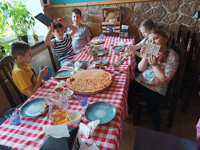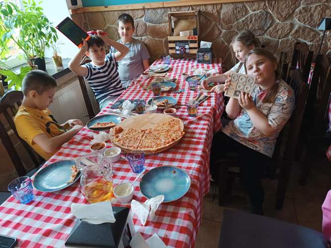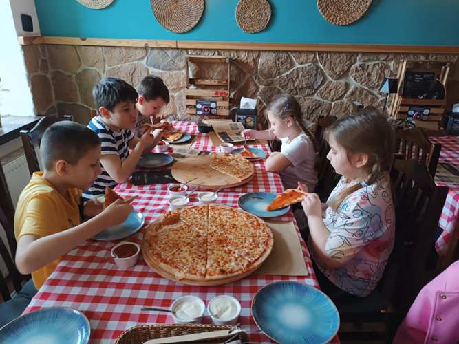 24.03.2025 r. uczniowie klasy pierwszej wraz wychowawczynią i Panią pomocą wyszli na pizzę do restauracji Kozacka. To wiosenne wyjście witające astronomiczną i kalendarzową wiosnę było nieznacznie opóźnione ale i tak dla nas widoczne, szczególne i niezapomniane. Nawet pogoda nam sprzyjała chociaż rano deszcz „lał jak z cebra” i było bardzo zimno wraz z naszym wyjściem ze szkoły pogoda jakby zaczarowana obdarowała nas ciepłem i pięknym słońcem.