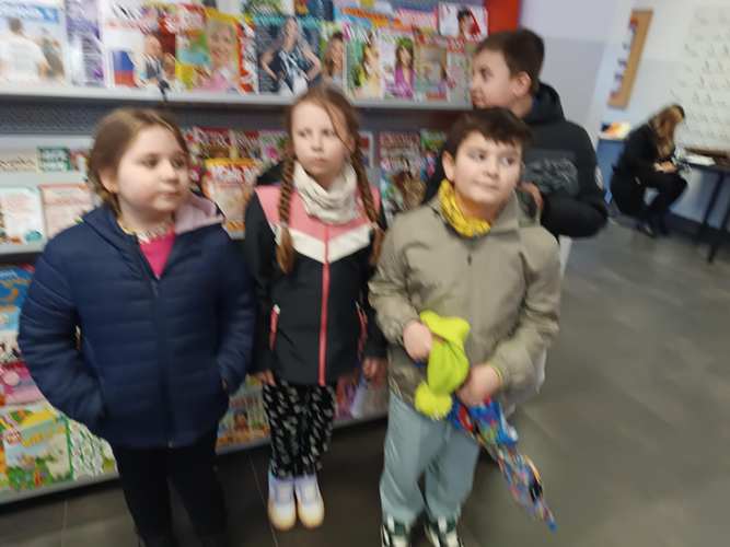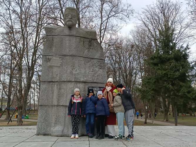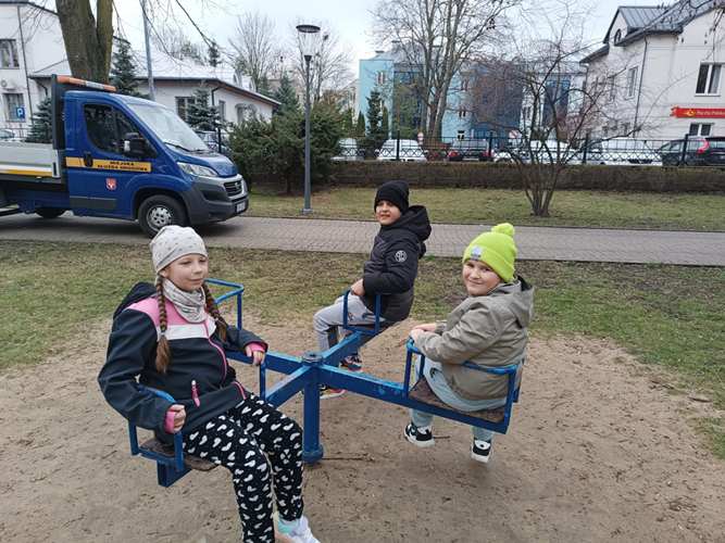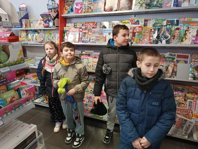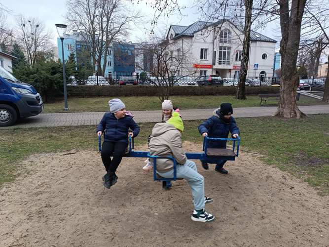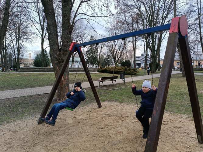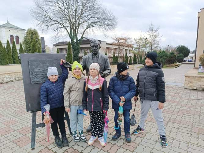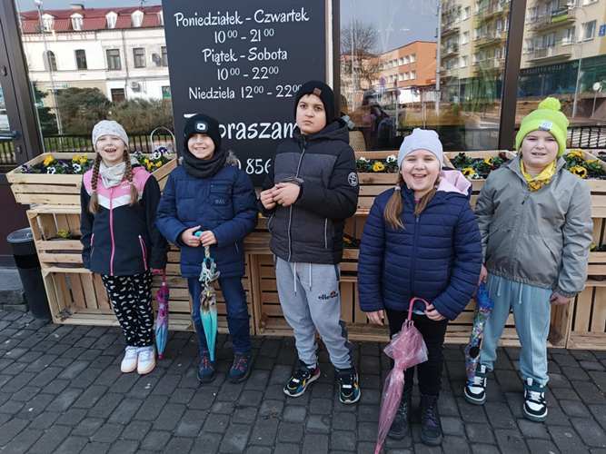 Na początku, po raz pierwszy w takim składzie osobowym weszliśmy grzecznie do restauracji, gdzie czekając krótką chwilkę otrzymaliśmy pyszne pizzy i sok. Kiedy brzuszki były już napełnione mogliśmy skorzystać z układanek, które znajdowały się w restauracji. Bawiliśmy się znakomicie. Następnie dziękując za miłe przyjęcie naszej gromadki udaliśmy się szukać wiosny do parku… i oczywiście znaleźliśmy ją w kwiatach budzących się do życia, wyrastającej z ziemi trawie jak też na huśtawkach, z których mogliśmy korzystać. Potem podeszliśmy pod pomnik Bolesława Prusa (Aleksandra Głowackiego), który jest wyjątkową postacią i twórcą wielu książek dla dzieci i nie tylko. Następnie idąc już do szkoły zatrzymaliśmy się pod postacią Wiktora Zina, gdzie uwieńczyliśmy naszą obecność pamiątkowym zdjęciem. Po czym karmiliśmy kaczuszki pływające w Huczwie: piękne, barwne, kolorowe….a na koniec wstąpiliśmy na pocztę gdzie mogliśmy zaobserwować pracę listonosza.