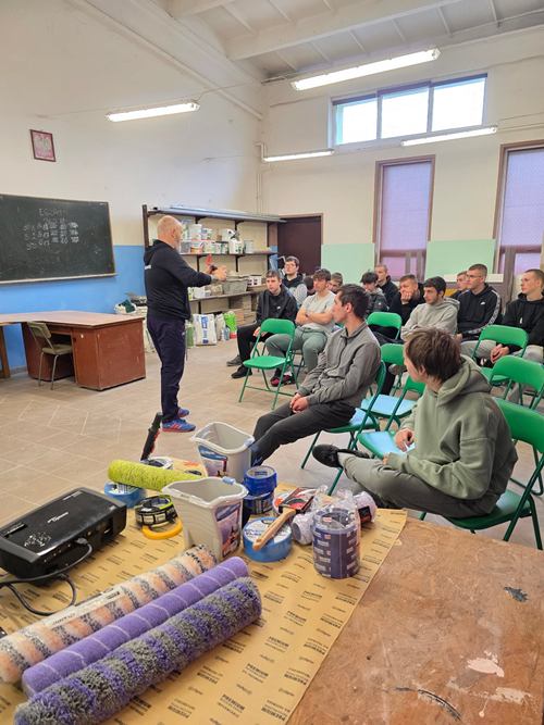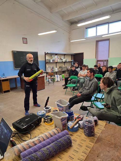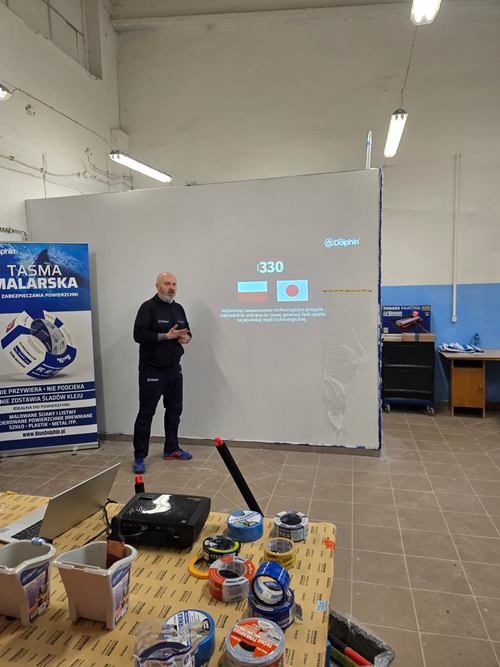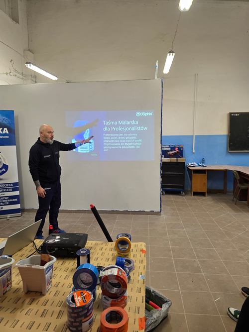 Uczniowie klasy I M monter zabudowy i robót wykończeniowych w budownictwie uczestniczyli w szkoleniu przeprowadzonym przez przedstawiciela firmy Blue Dolphin Pana Pawła Stegnerskiego. Producent Blue Dolphin od ponad 25 lat jest liderem wśród producentów taśm na rynku polskim i europejskim oraz znakomicie konkuruje na innych rynkach zagranicznych, takich jak USA i Kanada. Blue Dolphin to także wysokiej jakości wałki malarskie. Wałki Serii 330 oparte są na zaawansowanych technologicznie różnorodnych typach poszyć, opracowanych przez firmę z Japonii, która posiada ponad 100-letnie doświadczenie w tej branży.