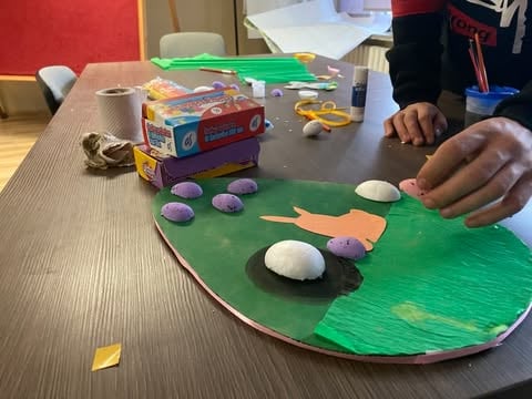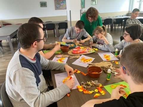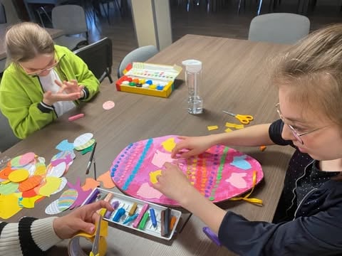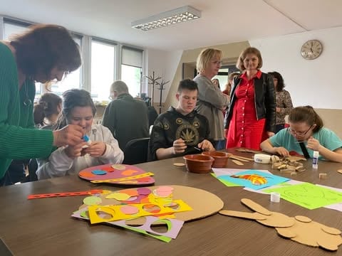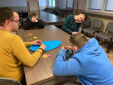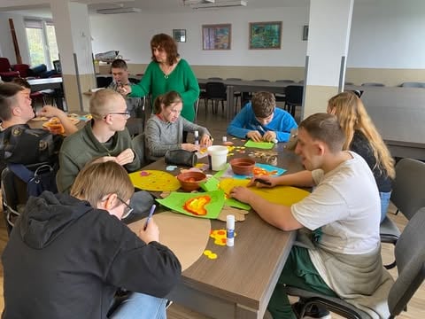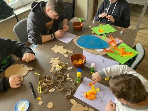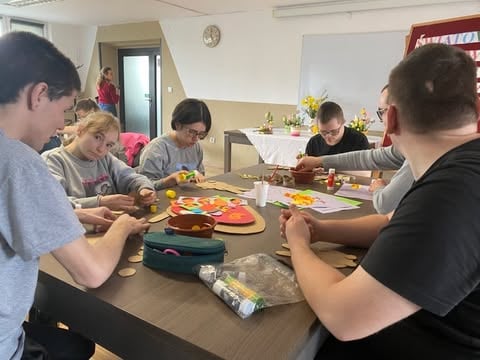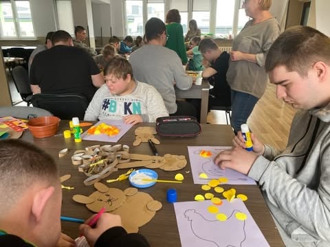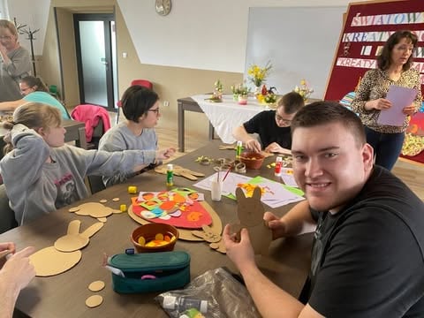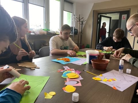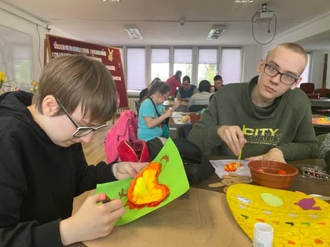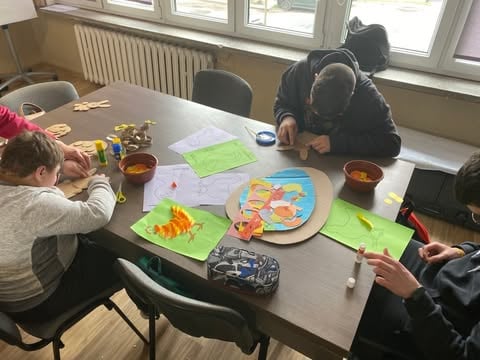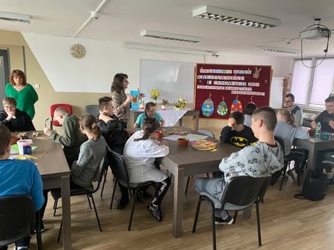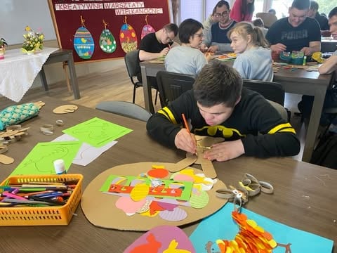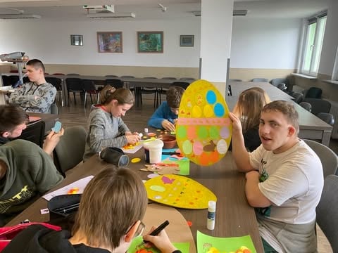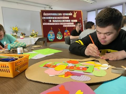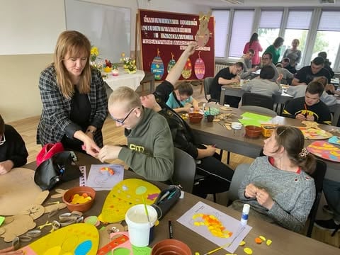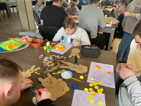 W naszej szkole w wyjątkowy sposób uczciliśmy Światowy Dzień Kreatywności i Innowacji 2025. Z tej okazji odbyły się „Kreatywne Warsztaty Wielkanocne”, w których z entuzjazmem uczestniczyli uczniowie klas PDP oraz wychowankowie grup internackich. Podczas spotkania szkolna sala konferencyjna zamieniła się w tętniące kolorami i pomysłami centrum twórczości. Wspólnymi siłami wykonywaliśmy: zajączki wielkanocne z papieru, materiałów dekoracyjnych i recyklingowych, pisanki, które zdobiliśmy przy użyciu farb, plasteliny, bibuły, pisanek i sznureczków, koguty i kurki – barwne, wesołe i pełne charakteru, które stały się ozdobą naszych klas. Praca przebiegała w atmosferze radości, wzajemnej pomocy i inspiracji. W tle słychać było śmiechy, rozmowy o tradycjach wielkanocnych oraz – co najważniejsze – zachwyty nad powstającymi dziełami. W trakcie warsztatów odwiedziła nas Pani dyrektor, która z zainteresowaniem przyglądała się działaniom uczestników. Jej obecność dodała wydarzeniu wyjątkowego charakteru i była dla nas dodatkową motywacją i miłym akcentem tego dnia. Powstałe prace zachwycają różnorodnością form, kolorów i technik. Każdy zajączek ma swój niepowtarzalny wyraz twarzy, pisanki to małe dzieła sztuki, a koguty i kurki dumnie prezentują się w wiosennej oprawie. Z pewnością wprowadzą one wszystkich w radosny, wielkanocny nastrój. Dziękujemy serdecznie wszystkim uczestnikom za wspólnie spędzony czas i niezwykle twórczą atmosferę. To był dzień pełen kolorów, pozytywnej energii – idealny przykład na to, jak kreatywność i wspólne działanie mogą łączyć.