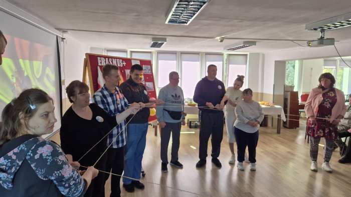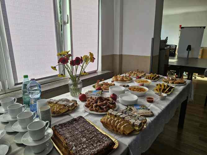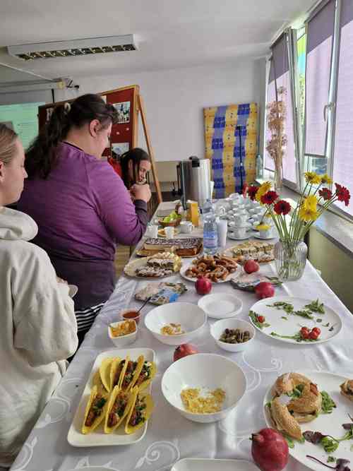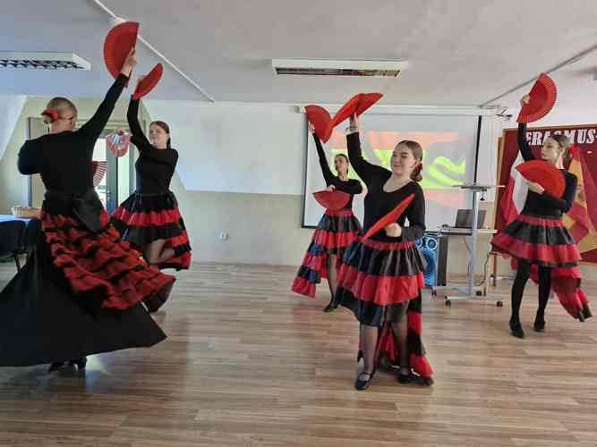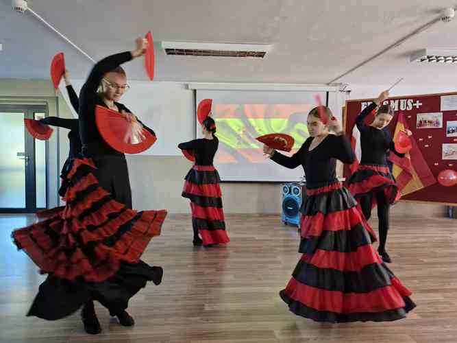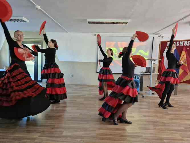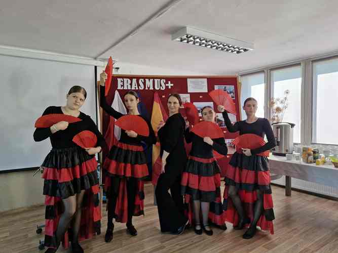25 września 2025 r. gościliśmy młodzież ze Środowiskowego Domu Samopomocy w Modryniu żeby podzielić się wrażeniami z programu Erasmus+ „Kolejny krok ku zmianie - mobilność kadry PZPSW w Hrubieszowie” (2024-1-PL01-KA122-SCH-000229302) realizowanym w Granadzie w Hiszpanii. Spotkanie rozpoczęło się pokazem tradycyjnego tańca Flamenco w wykonaniu szkolnego zespołu "Rytm". Zabawa integracyjna pozwoliła na zapoznanie się uczestników i poznanie hiszpańskiego pozdrowienia „Buenos Dias” Następnie nasi goście z zainteresowaniem obejrzeli prezentację pokazującą uroki Hiszpanii a zwłaszcza Granady. Prezentacja została uzupełniona opowieściami o wrażeniach z pobytu uczestników. Na koniec wszyscy uczestnicy spotkania mogli poznać smaki Hiszpanii. Na stole królowały: tapas, nachos, churros, hiszpańskie oliwki oraz granaty. Ciasta i przekąski powstały podczas lekcji otwartej w klasie I BC i klasie II K szkoły branżowej. Spotkaniu towarzyszyła wystawa zdjęć z hiszpańskiej przygody oraz muzyka gitarowa.