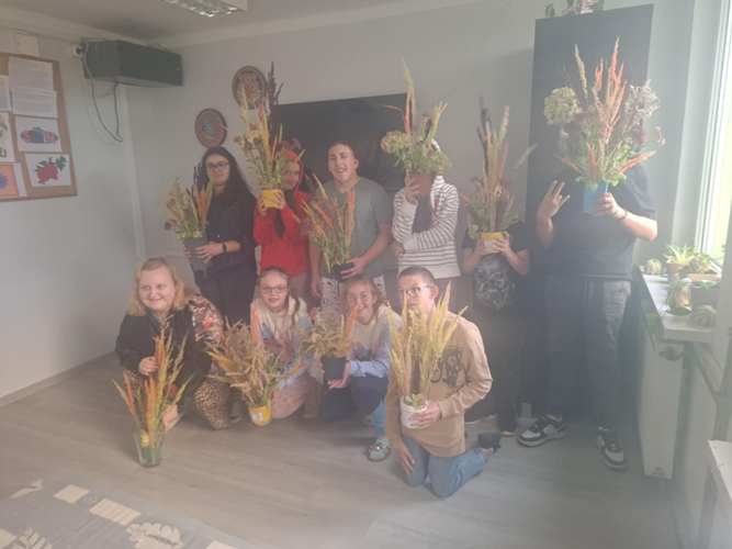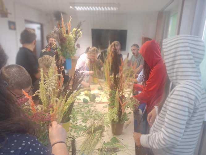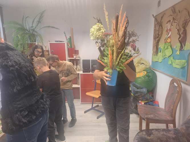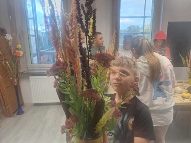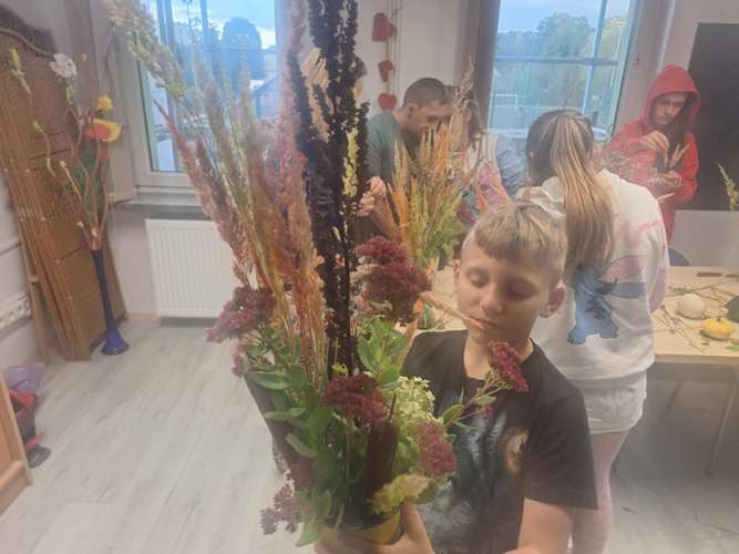 Zajęcia miały na celu rozwijanie wrażliwości estetycznej oraz umiejętności pracy zespołowej. Wychowankowie z zaangażowaniem dobierali kolory i kompozycje, a efektem ich pracy były piękne, barwne bukiety, które ozdobiły pomieszczenia internatu i wprowadziły jesienny nastrój. Atmosfera podczas zajęć była radosna i twórcza, a wykonane prace spotkały się z dużym uznaniem wychowawców oraz kolegów.