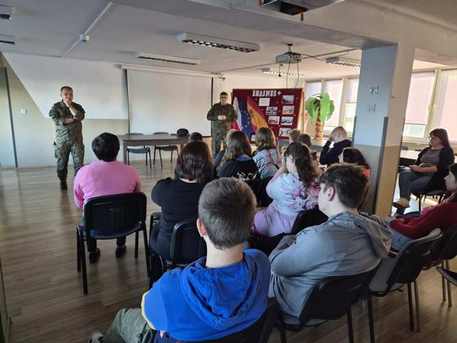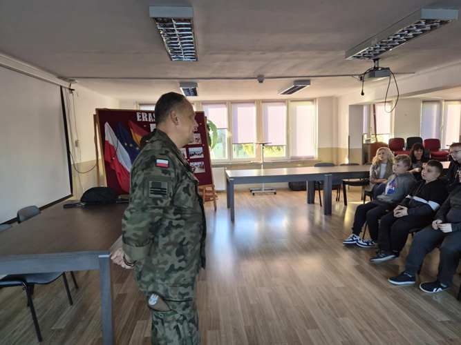 W dniu 13 października 2025 roku odbyło się spotkanie uczniów z żołnierzami Wojsk Obrony Terytorialnej. Celem wydarzenia było poszerzenie wiedzy młodzieży na temat bezpieczeństwa narodowego, odpowiedzialności obywatelskiej oraz specyfiki służby wojskowej. Podczas spotkania żołnierze opowiadali o swojej codziennej pracy, obowiązkach i misji, jaką pełnią w strukturach Wojsk Obrony Terytorialnej. Przybliżyli uczniom znaczenie WOT w systemie obronnym kraju oraz pokazali, jak wygląda służba w tej formacji. Uczniowie dowiedzieli się również, jakie wartości są najważniejsze w życiu żołnierza – odwaga, poświęcenie, dyscyplina i gotowość do działania na rzecz innych.