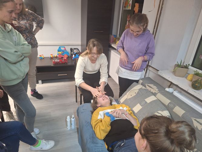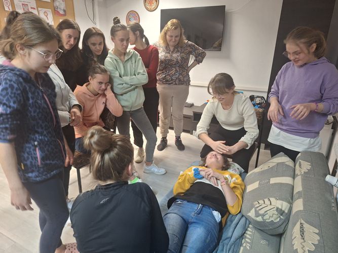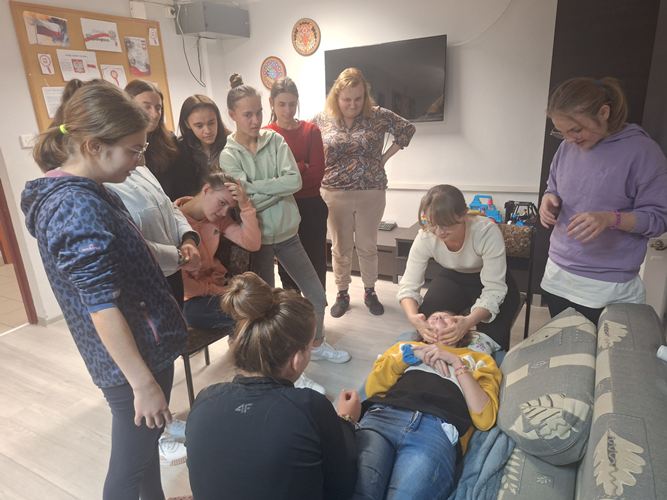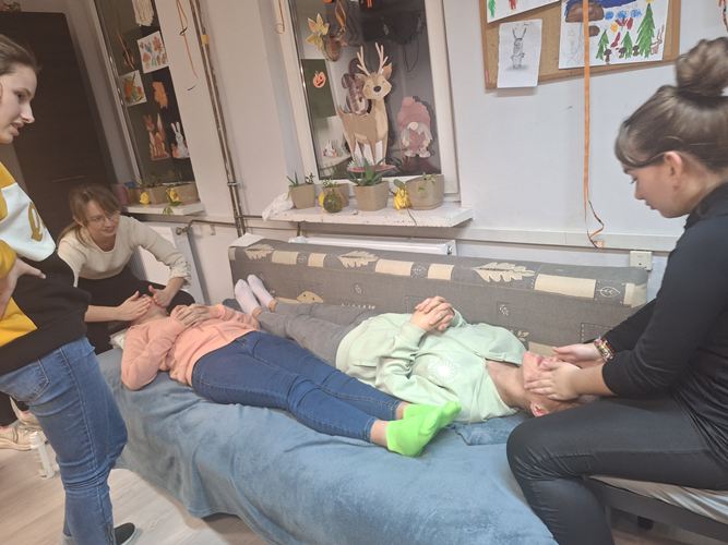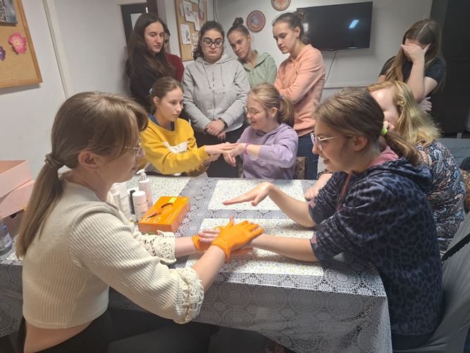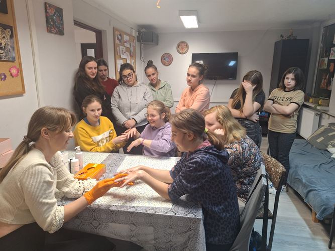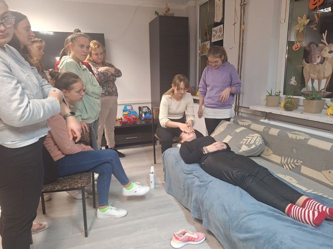 W dniu 20.11.2025 r. odbyło się spotkanie dziewcząt z grup internackich z zaproszoną panią kosmetolog z salonu "Cuda Wianki Fryzjerstwo i Kosmetyka" poświęcone zasadom prawidłowej higieny skóry twarzy oraz podstawowym technikom masażu dłoni i twarzy. Podczas spotkania omówiono: znaczenie codziennej higieny skóry twarzy, etapy prawidłowej pielęgnacji (oczyszczanie, tonizacja, nawilżanie), dobór kosmetyków odpowiednich do typu cery, najczęściej popełniane błędy pielęgnacyjne. Pani kosmetolog zwróciła uwagę na wpływ regularnych nawyków higienicznych na kondycję skóry oraz przedstawiła praktyczne wskazówki dotyczące bezpiecznego stosowania kosmetyków. Następnie zaprezentowała masaż dłoni i twarzy, omawiając jego działanie relaksacyjne, poprawiające krążenie i elastyczność skóry. Uczestniczki mogły obserwować poszczególne etapy masażu oraz samodzielnie wykonywać masaż. Spotkanie spotkało się z dużym zainteresowaniem dziewcząt, a przekazana wiedza okazała się wartościowa i przydatna w codziennej pielęgnacji.