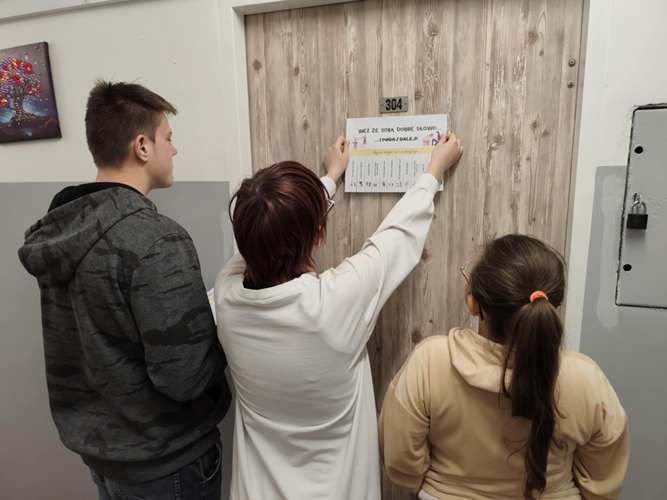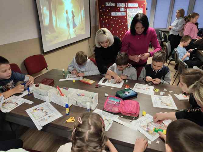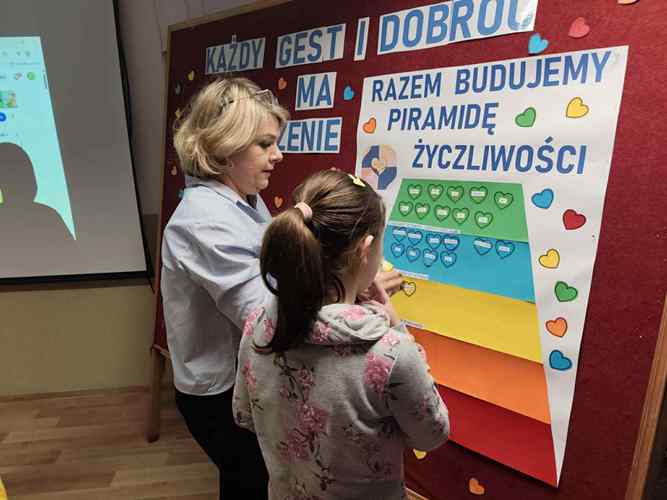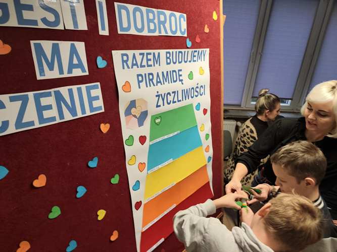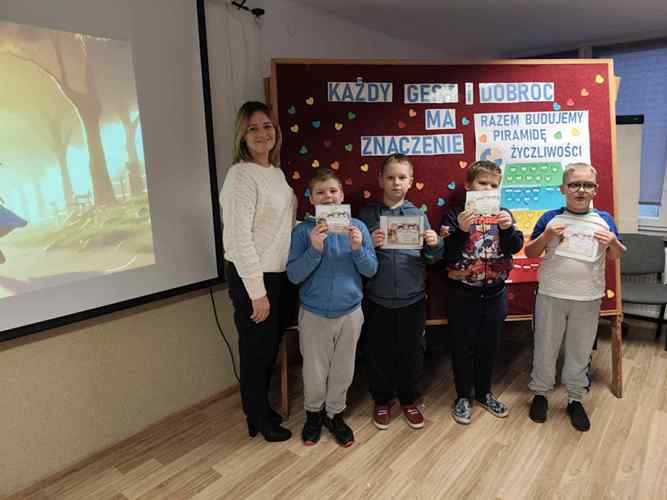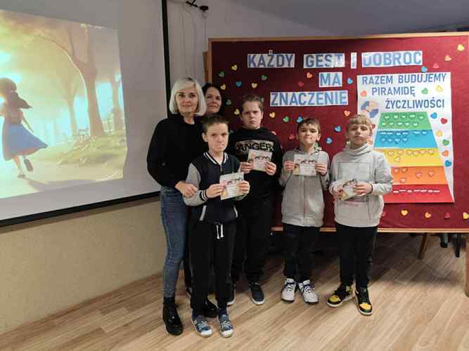 o tym, jak można pomagać, wspierać i wywoływać uśmiech na twarzach innych. Warsztaty stały się nie tylko okazją do twórczej pracy lecz także do rozmów o tym, że życzliwość nie wymaga wielkich czynów często zaczyna się od kilku prostych słów lub gestów. W tegoroczne obchody aktywnie włączyły się również klasy starsze, które postanowiły podzielić się życzliwością w całej społeczności szkolnej. Uczniowie przygotowali i roznosili kartki z dobrymi słowami pełne wsparcia, otuchy i pozytywnej energii. Trafiały one do nauczycieli, pracowników szkoły oraz młodszych uczniów, wywołując szczere uśmiechy i budując atmosferę wzajemnego szacunku i sympatii. Ten prosty gest pokazał, że dobro naprawdę potrafi się mnożyć.