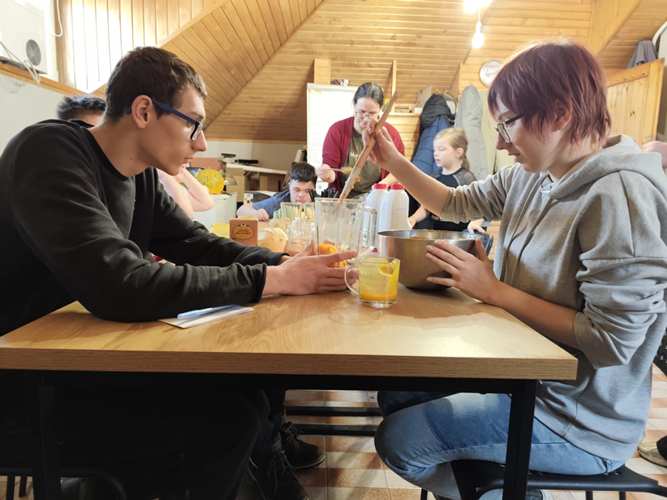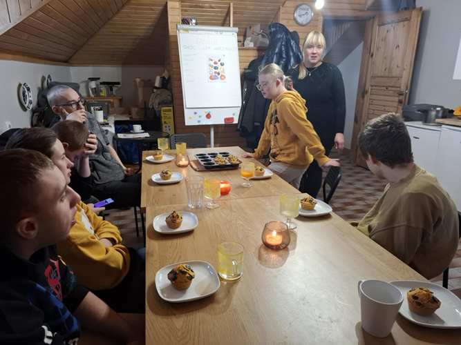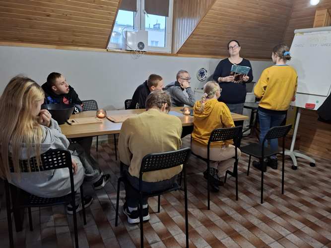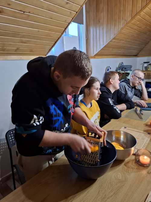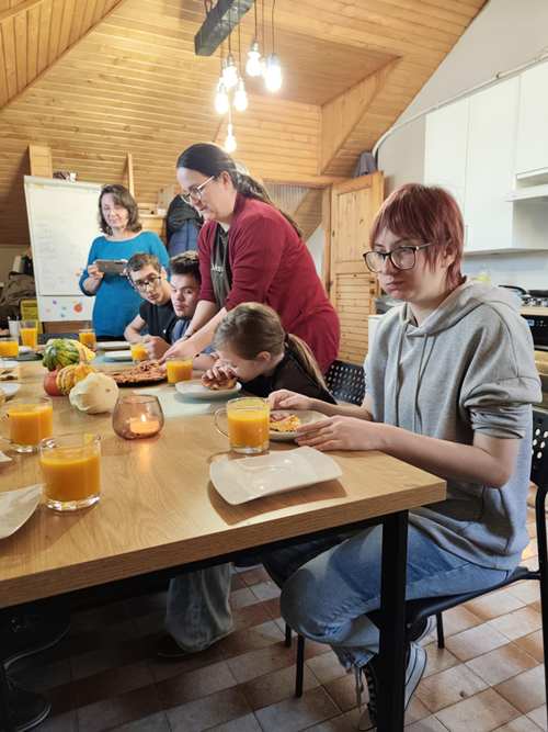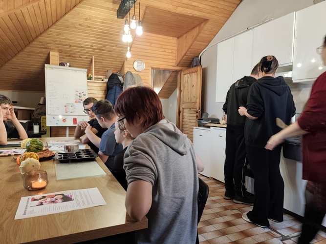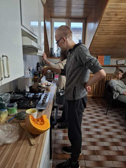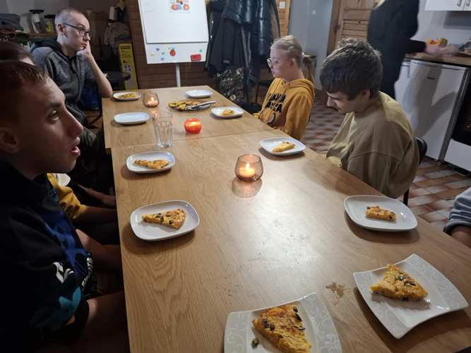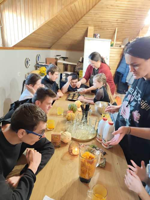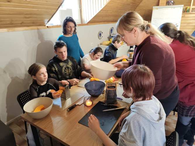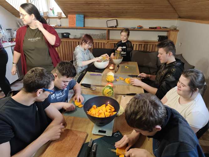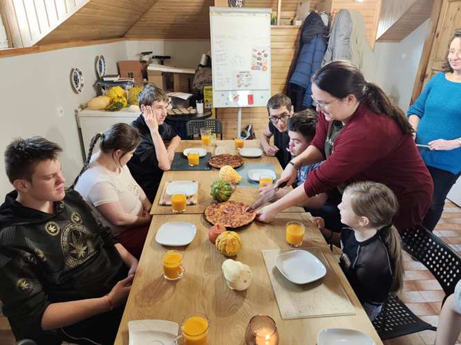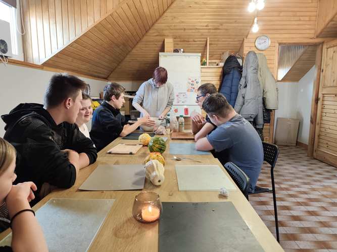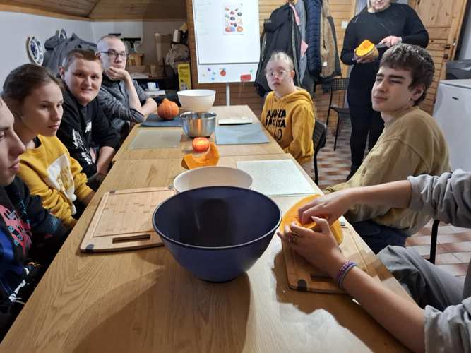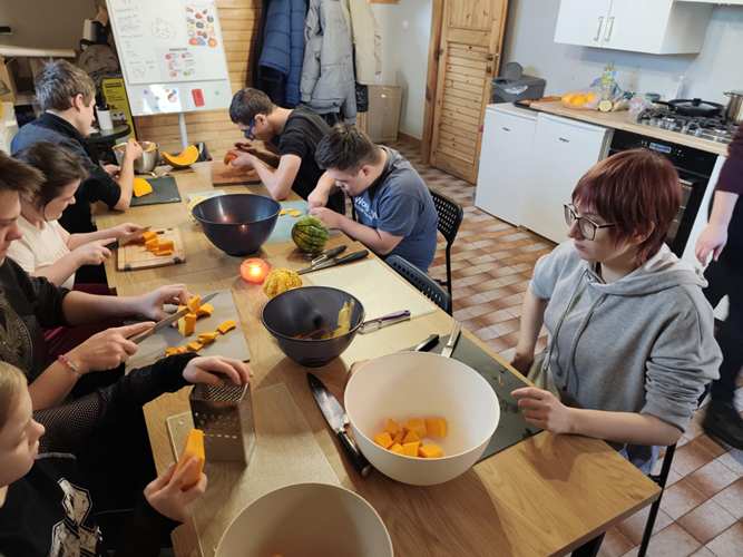 W dniach 20 i 24 listopada uczniowie Szkoły Przysposabiającej do Pracy uczestniczyli w warsztatach kulinarnych, zorganizowanych przez panie pracujące w kawiarni "Coffee House". Uczestnicy poznali różne gatunki dyni oraz ich zastosowanie i wartości zdrowotne. Uczniowie zaangażowali się w odbieranie, tarcie i gotowanie dyni na różne sposoby. Smacznym efektem tych działań była pizza z patelni, muffinki oraz zdrowy , przecierowy sok z dodatkiem pomarańczy. Wszyscy ochoczo pałaszowali swoje wyroby. Na koniec zostaliśmy poczęstowani dyniową latte o niecodziennym, intensywnym smaku. Bardzo miło i efektywnie spędziliśmy czas, zabawa była doskonała. Podziękowaliśmy paniom za wspaniałe zajęcia, wyrażając nadzieję na kolejne spotkanie.