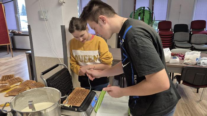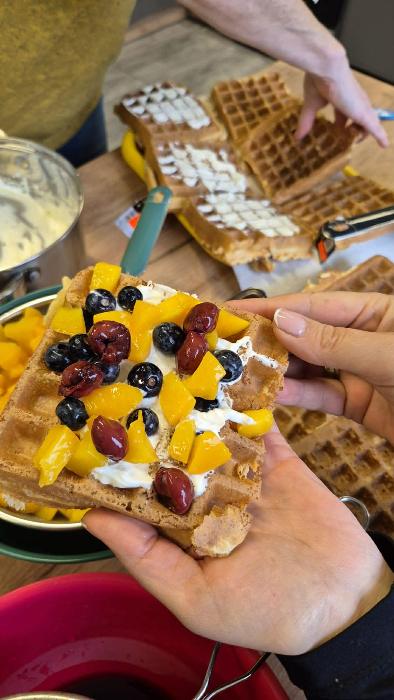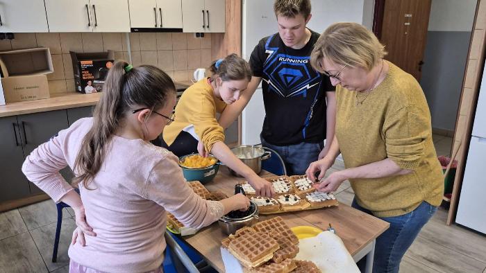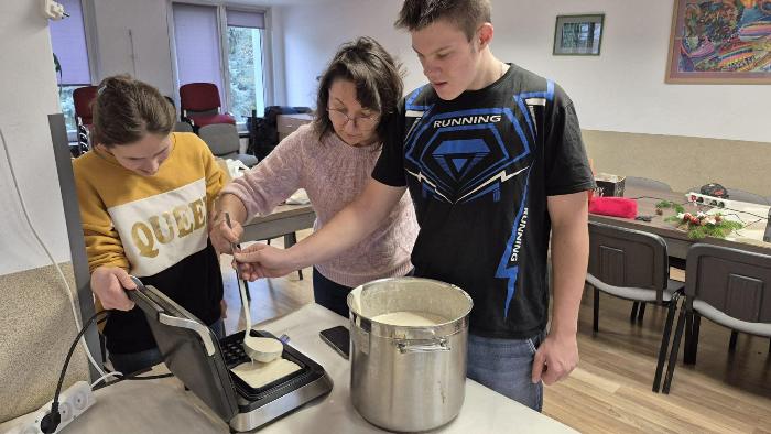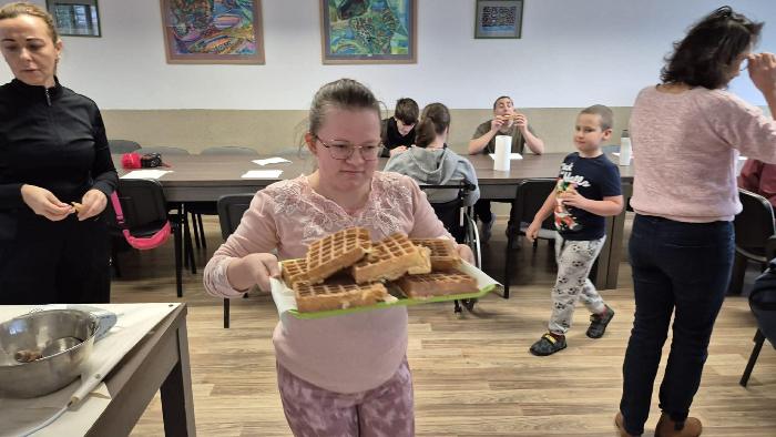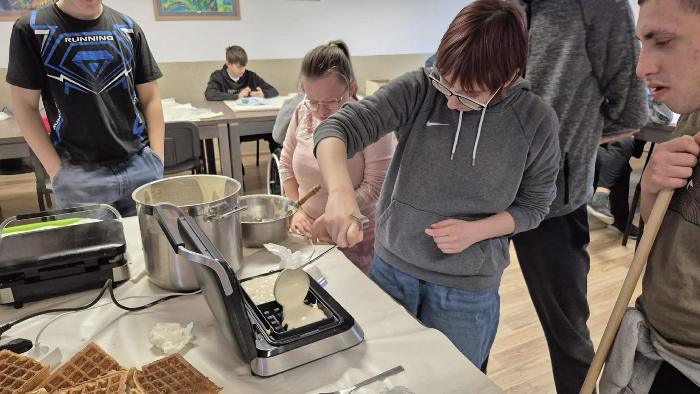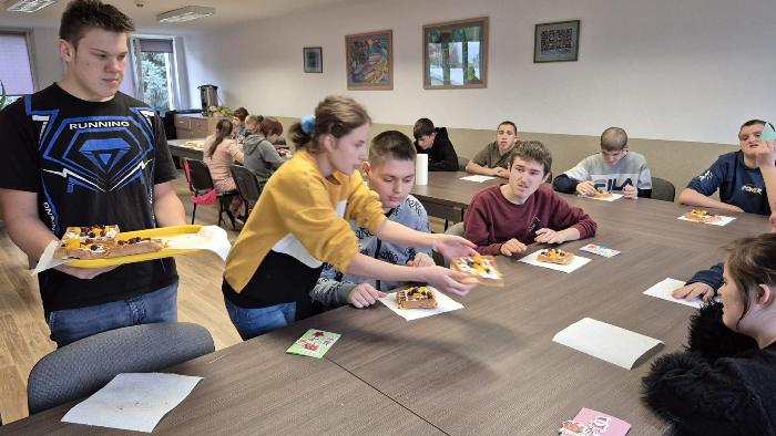 27 listopada w klasach PDP odbyły się warsztaty kulinarno-plastyczne, które stały się dla uczniów okazją do rozwijania samodzielności, praktycznych umiejętności oraz twórczej ekspresji. Spotkanie przebiegało w serdecznej atmosferze, a uczniowie chętnie angażowali się w kolejne etapy wspólnych działań. W części kulinarnej młodzież przygotowywała domowe gofry.Uczniowie, pod okiem nauczyciela, odmierzali składniki, mieszali ciasto i samodzielnie nakładali je do gofrownicy. Podczas pracy doskonalili koordynację ruchową, precyzję oraz umiejętność współdziałania. Po upieczeniu każdy ozdabiał swoje gofry bitą śmietaną i kolorowymi owocami tworząc własne, apetyczne kompozycje. Była to zarówno nauka estetycznego podawania potraw, jak i okazja do cieszenia się wspólnym przygotowywaniem smakołyków.