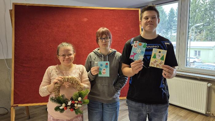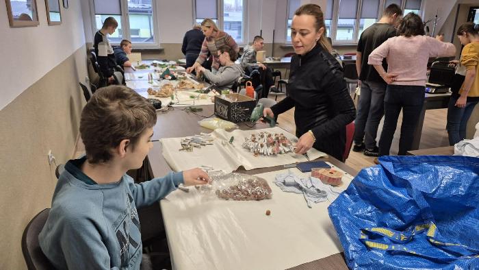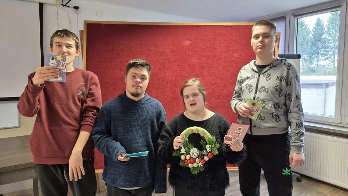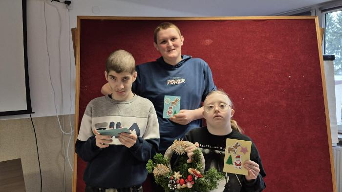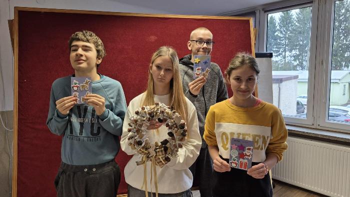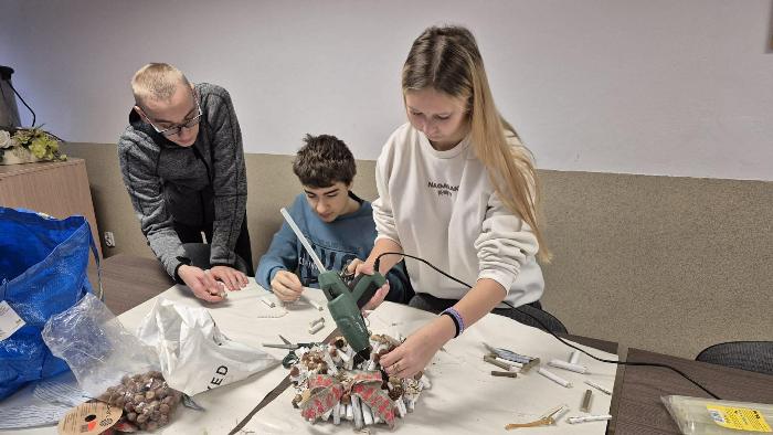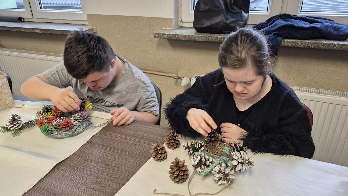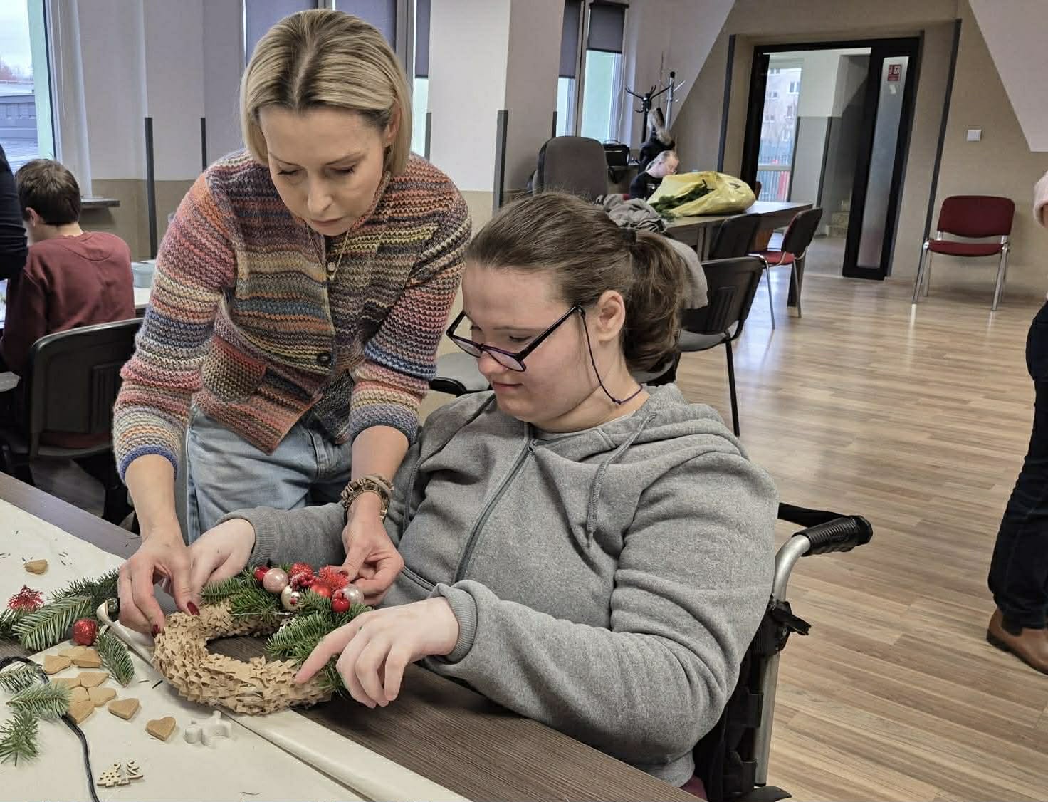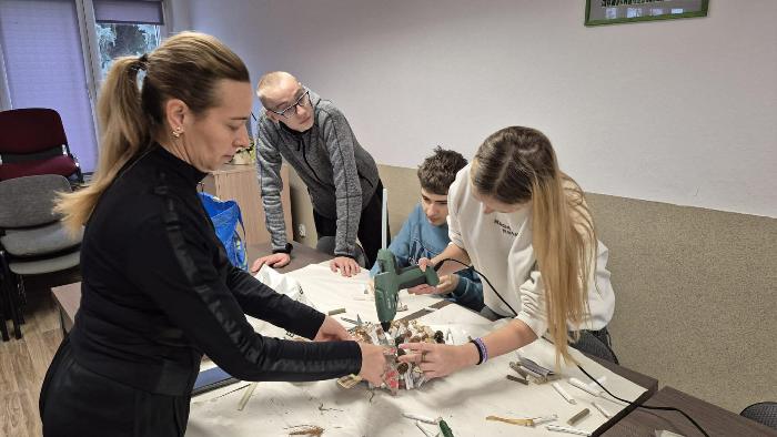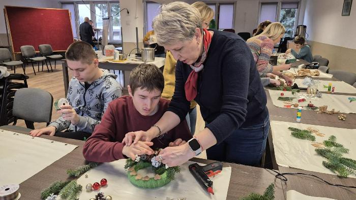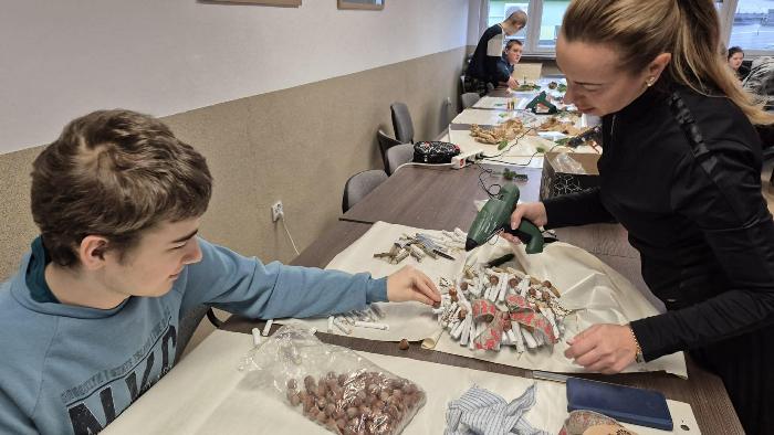 Równolegle odbywała się część plastyczna, podczas której uczniowie tworzyli kartki oraz dekoracje świąteczne. Dobierali naklejki, elementy zdobnicze i samodzielnie komponowali projekty kartek. Ćwiczyli przy tym motorykę małą, dokładność, cierpliwość i planowanie kolejnych kroków. Powstały również efektowne stroiki i wianki, ozdobione świerkowymi gałązkami, bombkami, kokardami, szyszkami i drewnianymi dodatkami. Każda praca była niepowtarzalna i pełna przedświątecznego klimatu. Całe warsztaty przebiegały w duchu współpracy i wzajemnego wspierania się.Uczniowie nie tylko zdobywali nowe umiejętności praktyczne i artystyczne, ale także wzmacniali poczucie sprawczości oraz radość z tworzenia. Efektem zajęć były smaczne wypieki, piękne dekoracje i wiele pozytywnych emocji, które stały się dla uczniów wartościowym doświadczeniem rozwijającym ich codzienne kompetencje.