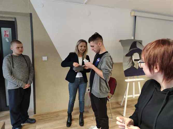 Uczniowie uważnie obejrzeli również film edukacyjny o tradycjach andrzejkowych, bo po nim odpowiadali na pytania dotyczące ludowego święta. Każdy z uczestników zabawy, który prawidłowo odpowiedział na pytanie, dostawał słodki upominek.