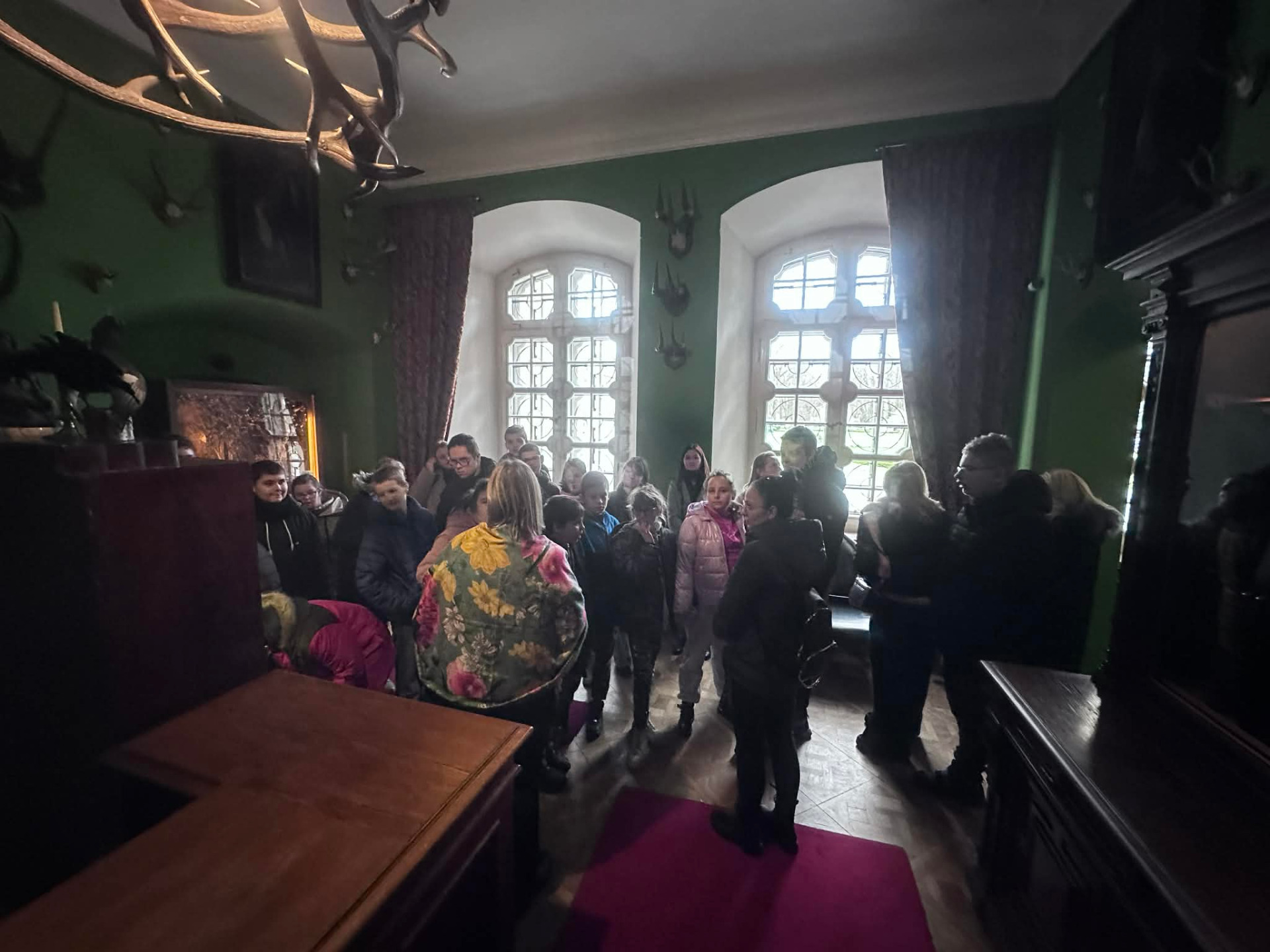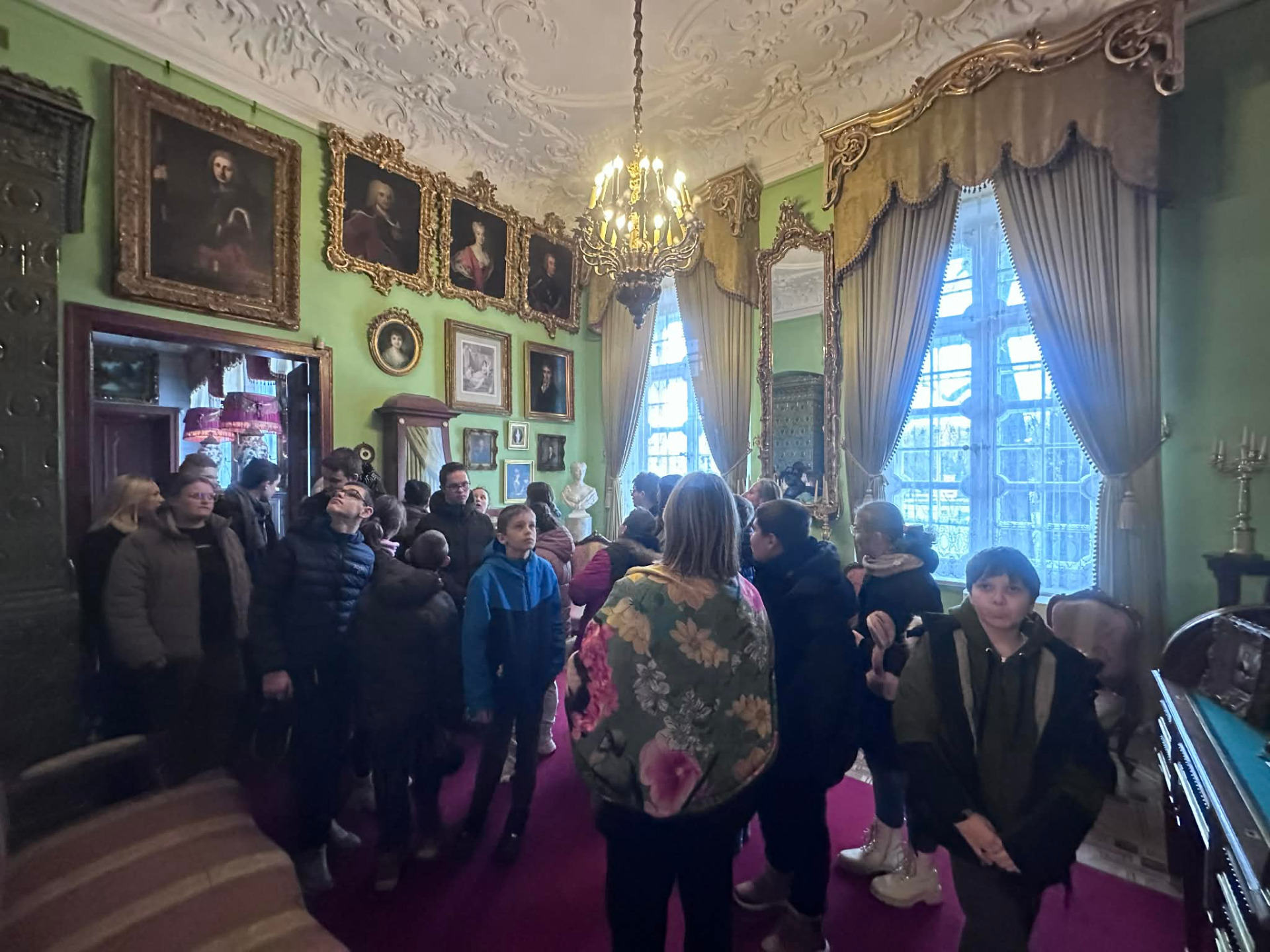 27 listopada 2025 roku uczniowie klas IV-VIII wybrali się na wycieczkę finansowaną z Rządowego programu MEN - Wyjście z klasą. Najpierw zwiedzili zabytkowy zespół pałacowo- parkowy i powozownię w Kozłówce, siedzibę rodu Bielińskich i Zamoyskich. Poznali historię regionu. Pałac jest jednym z najlepiej zachowanych rezydencji arystokratycznych w Polsce. W jego wnętrzach kręcono sceny do kostiumowego serialu „Matylda”. Znajduje się tu jedyna w Europie unikalna kolekcja dzieł z okresu socrealizmu. Park w stylu francuskim z pawiami, otaczający pałac, inspirowany jest ogrodem wersalskim. Następnie- uczestniczyli w kreatywnych warsztatach- Elegancja, Francja- moda XIX wieku.