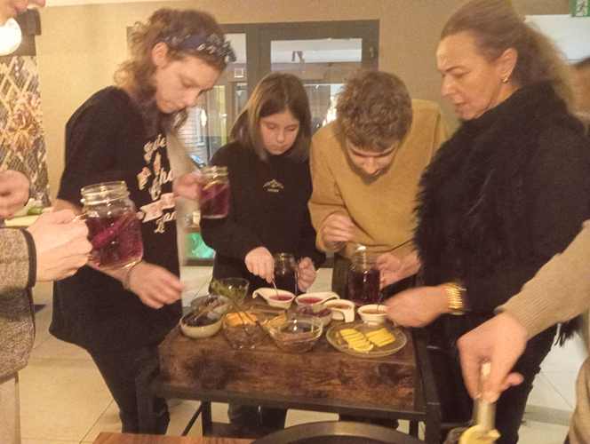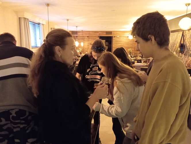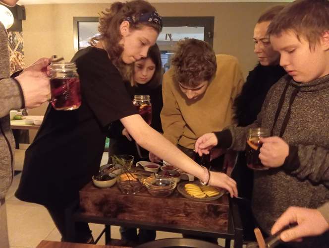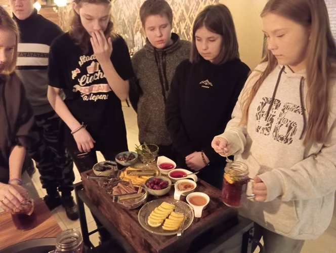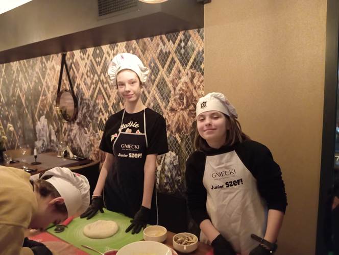 Kolejnym punktem naszej wędrówki była tym razem uczta dla ciała czyli warsztaty parzenia herbaty i robienia pizzy. W ten niesamowicie aromatyczny klimat przeniósł nas szef kuchni Hotel&Restauracja Gniecki pan Łukasz Jasiński. Uczniowie poznali sposoby oraz techniki parzenia herbaty, dowiedzieli się o jej właściwościach leczniczych i zdrowotnych. Najprzyjemniejszą częścią był jednak wybór herbat oraz ich samodzielne przyrządzenie. Można było wzbogacić smak herbaty nietuzinkowymi przyprawami w postaci: cytryny, goździków, rozmarynu, anyżu itp.