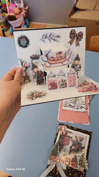 1. Metoda Pop-up – dzięki której po otwarciu kartki wyłaniają się z niej trójwymiarowe choinki i prezenty.