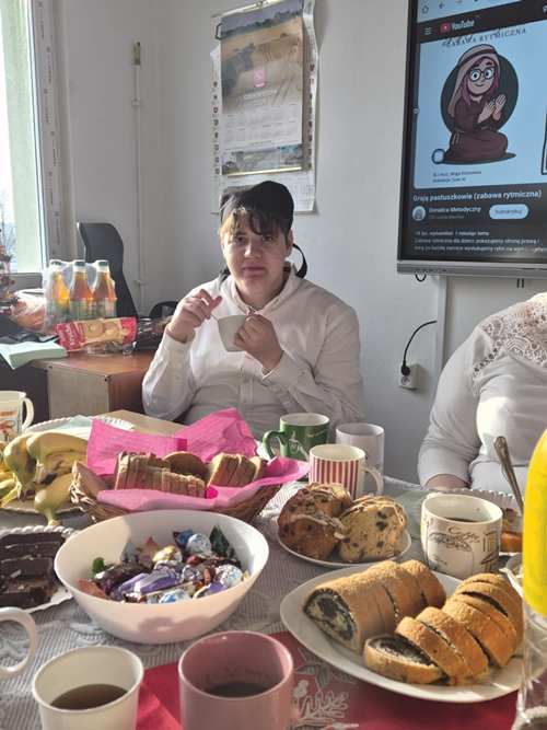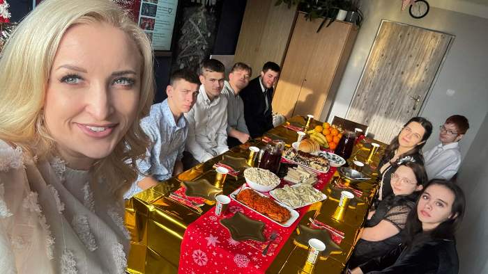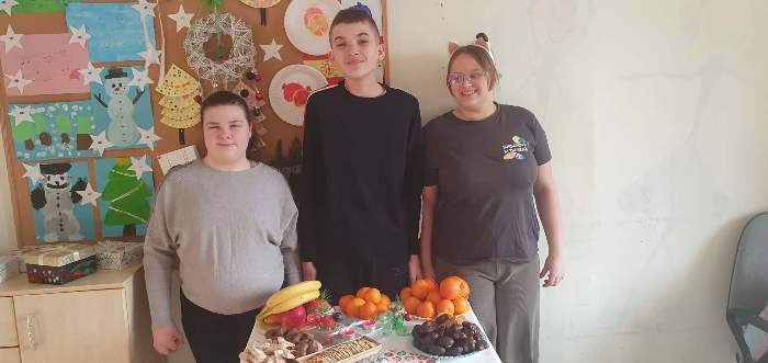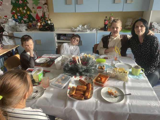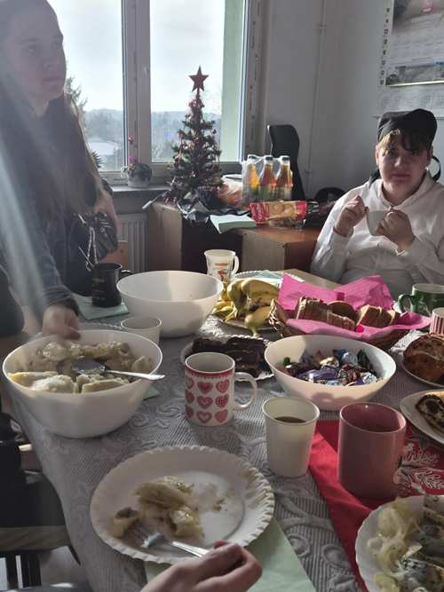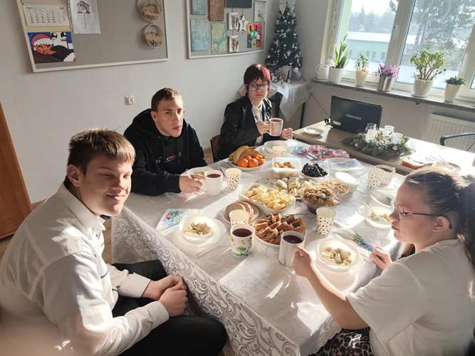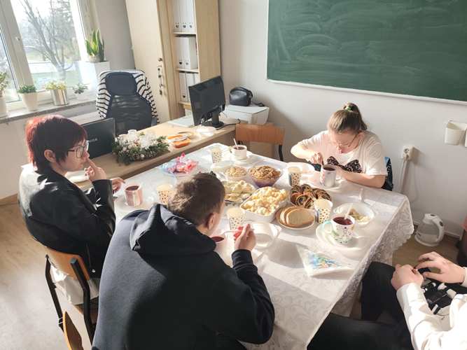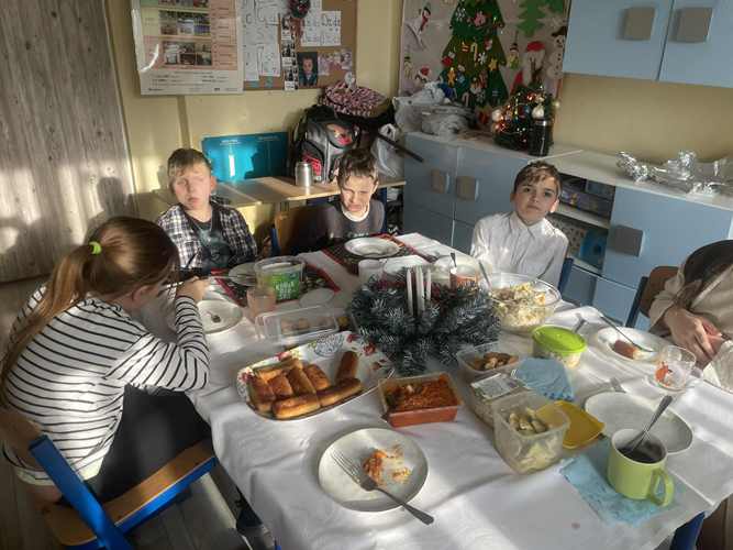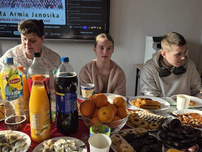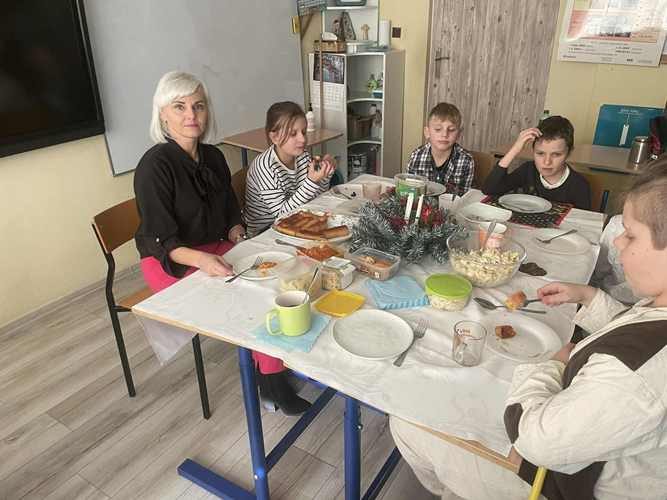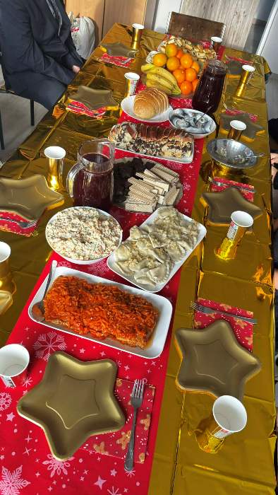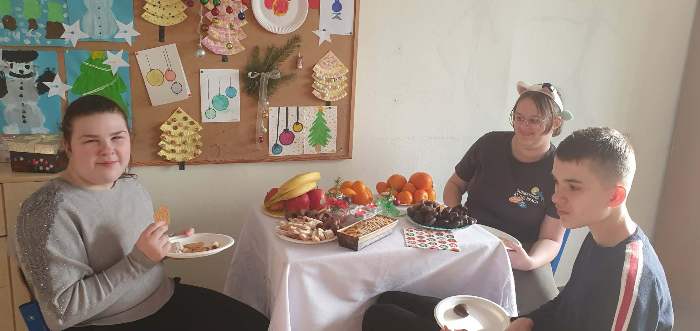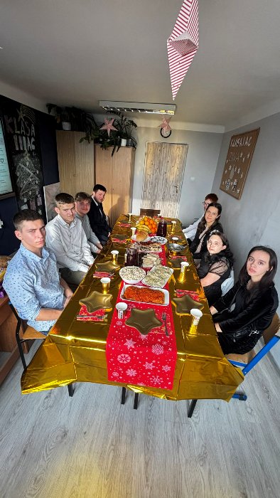 Po jasełkach szkolnych uczniowie spotkali się przy wigilijnych stołach. Po podzieleniu się opłatkiem i złożeniu życzeń wspólnie śpiewali kolędy.