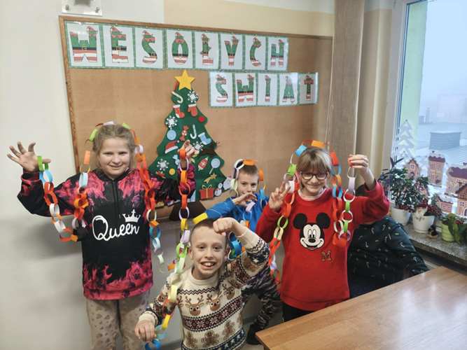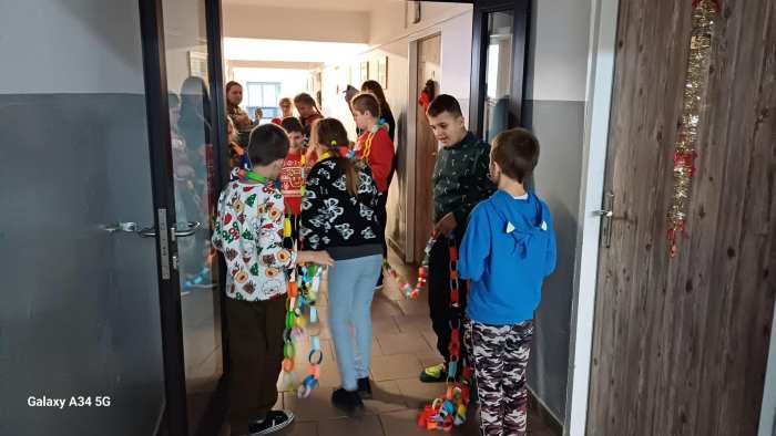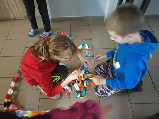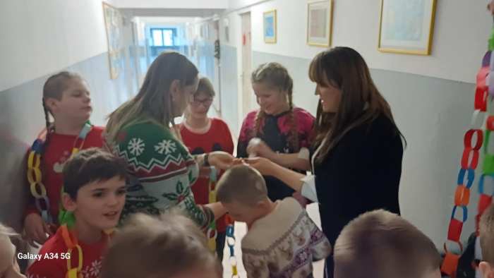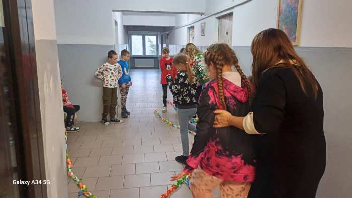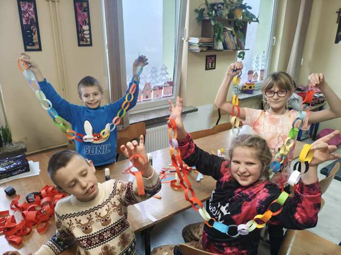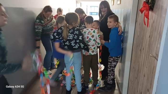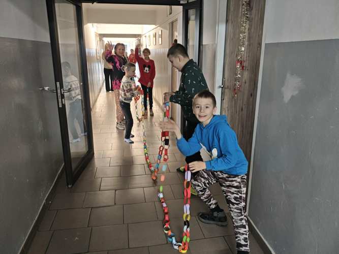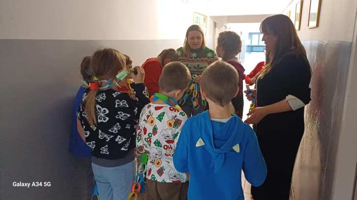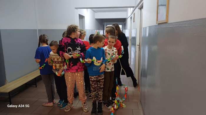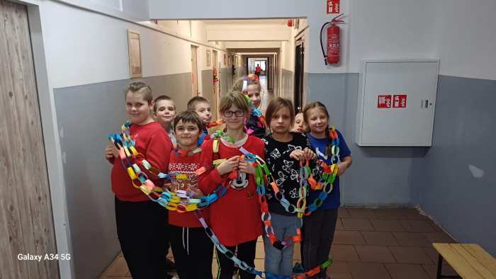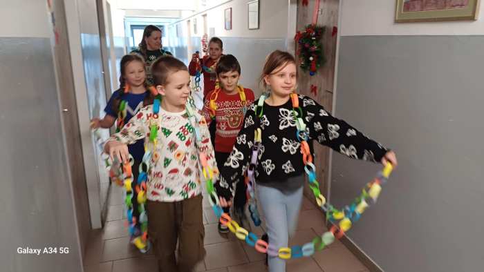 W dwóch świetlicach szkolnych 220 i 222 odbyło się wyjątkowe, międzyświetlicowe wydarzenie. W atmosferze radosnego oczekiwania na święta dzieci wspólnie tworzyły łańcuch dobrych życzeń. Każda ze świetlic przygotowała swój własny łańcuch z kolorowych, papierowych kół. Podczas pracy wspólnie zastanawiano się jakie życzenia można przekazać sobie nawzajem. Kulminacyjnym momentem było połączenie obu łańcuchów w jedną, długą i barwną całość, symbolizującą współpracę, integrację oraz wspólne świętowanie. Spotkaniu towarzyszyła radosna zabawa, wzajemne składanie życzeń oraz prawdziwie świąteczna atmosfera pełna uśmiechu i życzliwości. Wydarzenie było doskonałą okazją do integracji dzieci oraz budowania pozytywnych relacji w szkolnej społeczności.